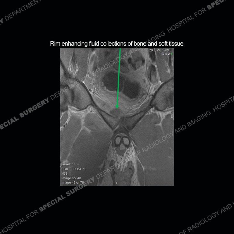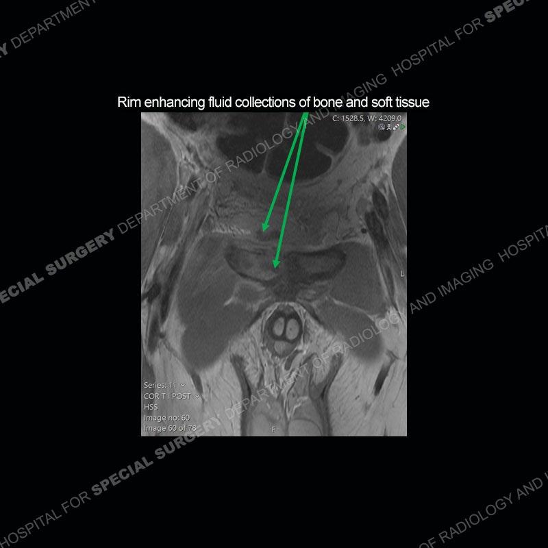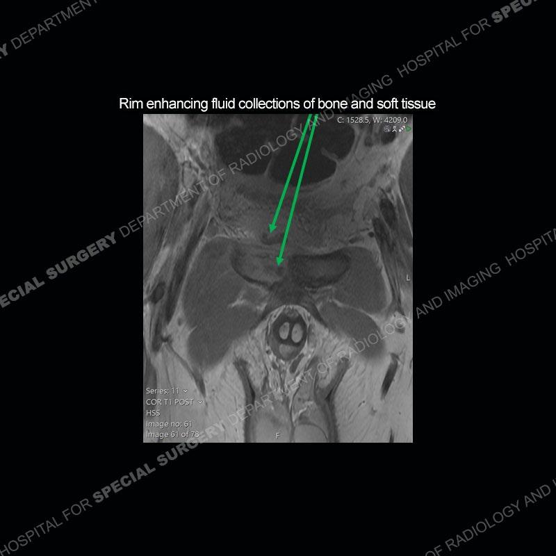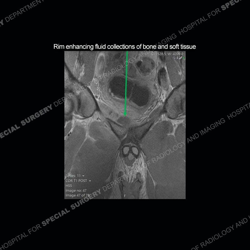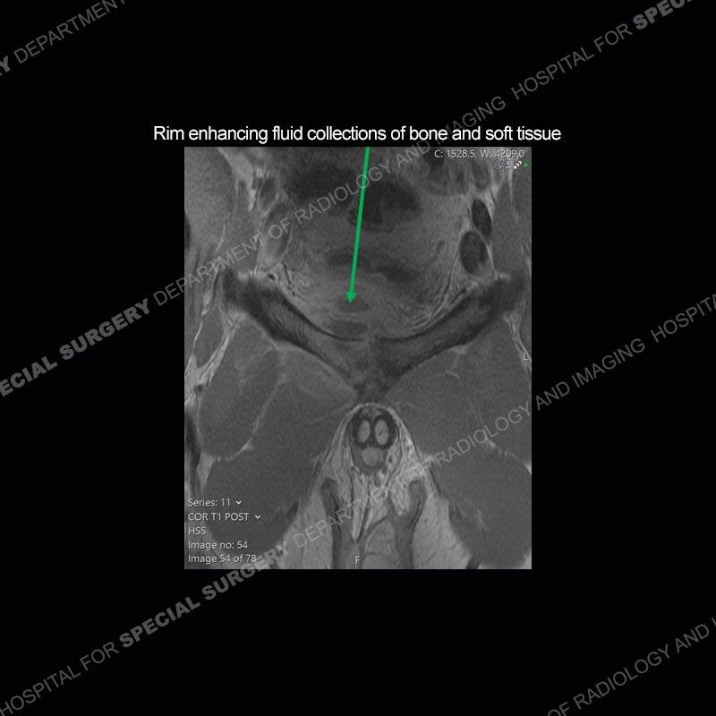 The repeat MRI, with the marked degree of increased abnormality of the bone and soft tissue shifted the diagnosis to a high degree towards infection. Even the most aggressive of neoplasms would not have that the degree of change in a 3-day time span. The CT study was shown before the repeat MRI but actually occurred just after the repeat MRI. It helped confirm the destructive process of the ramus and particularly the abnormal architecture along the inferior margin. The patient went on to have a CT guided aspiration of one of the soft tissue collections with 4cc of purulent fluid obtained. A surgical irrigation and debridement of the bone and soft tissue was performed. A PICC line was placed and the patient is currently undergoing IV antibiotic treatment with a possible repeat irrigation and debridement.