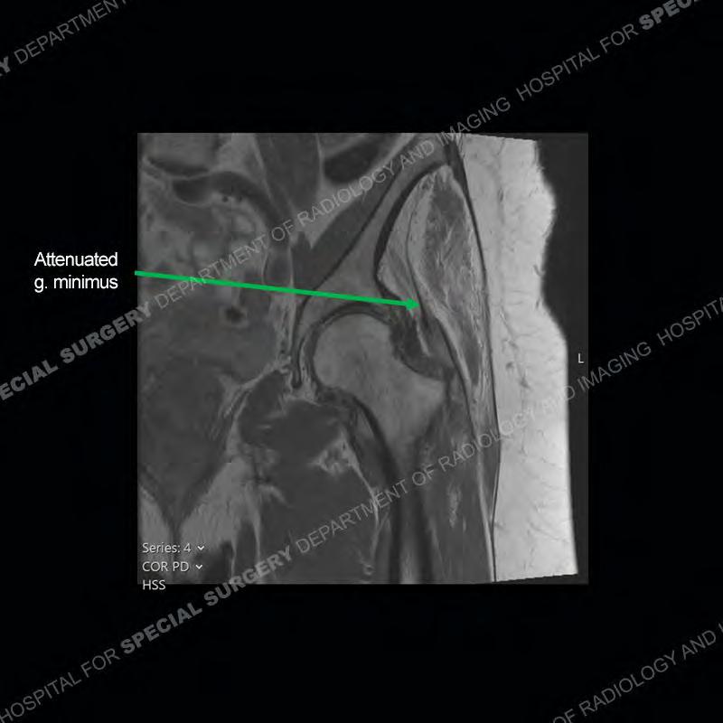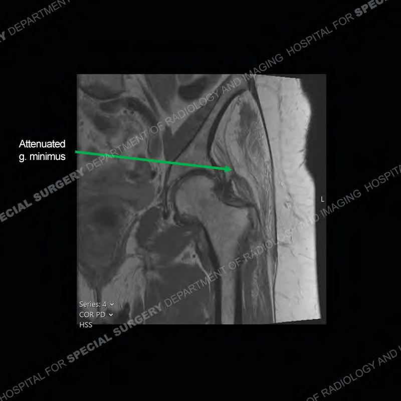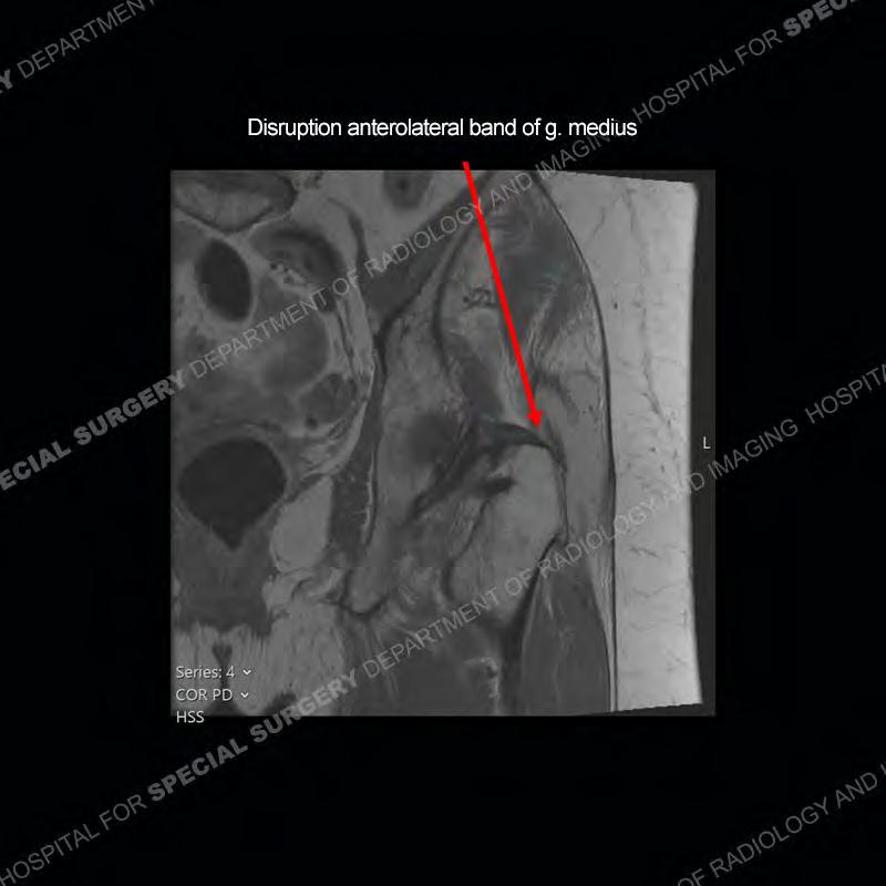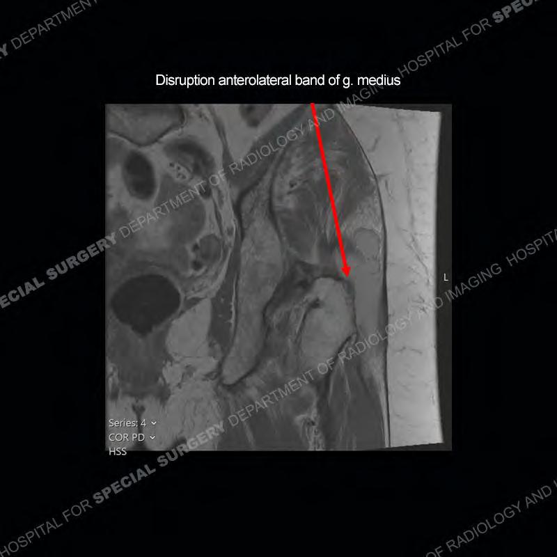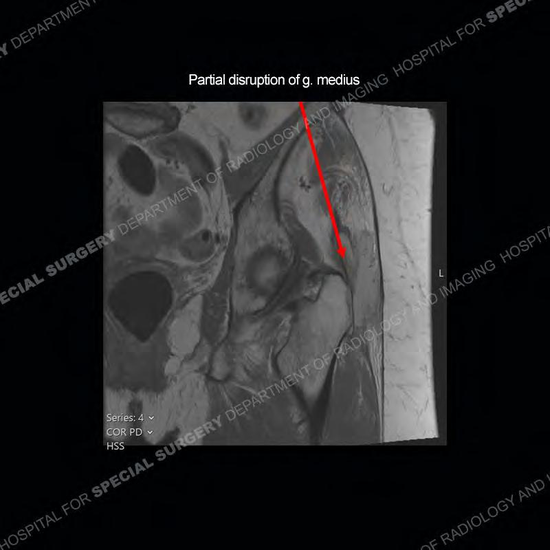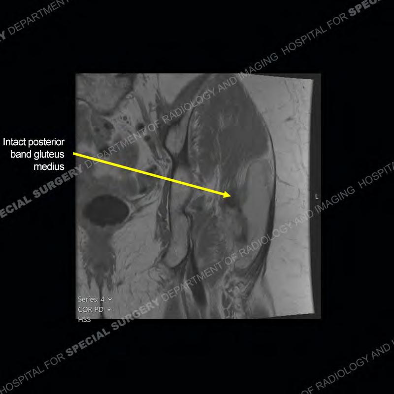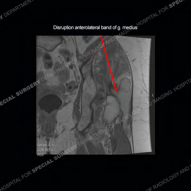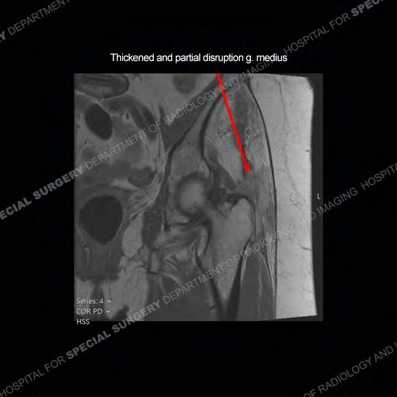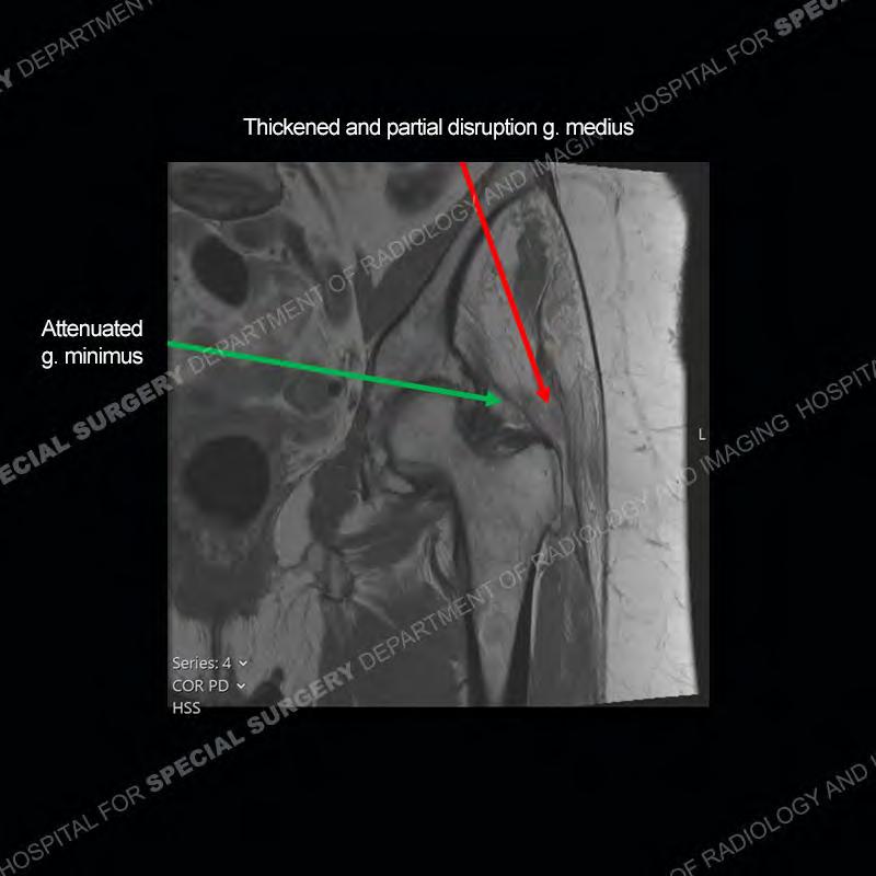 Not as much of a diagnostic dilemma as many of the other cases shown but just a nice example of the pathology seen of the gluteal tendons and a cause of trochanteric pain. Although, frequently thought of in isolation, trochanteric bursitis or bursal thickening is much more commonly a reactive change to underlying pathology of the subjacent gluteal tendons. The gluteus medius is divided into a posterior band and an anterolateral band. Tendinosis and partial tearing very commonly will involve the gluteus minimus and especially the more posterior fibers and then propagate into the anterior lateral band of the gluteus medius. Involvement of the posterior band of the medius is much less common and engenders a marked degree of functional impairment.