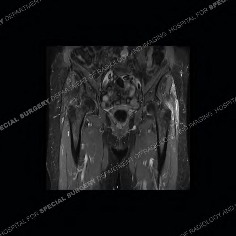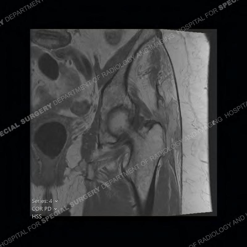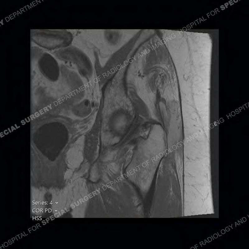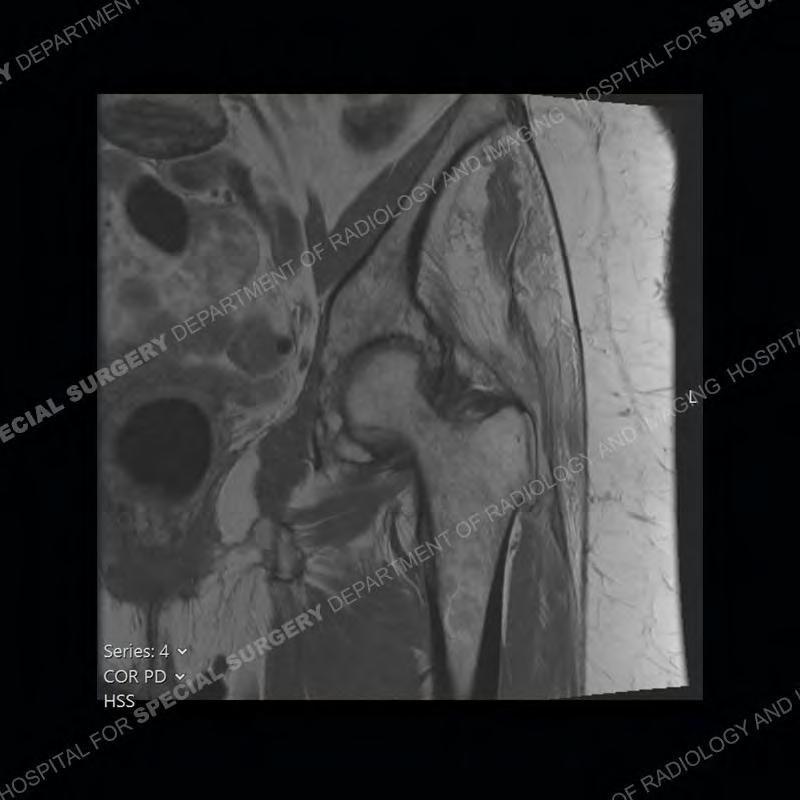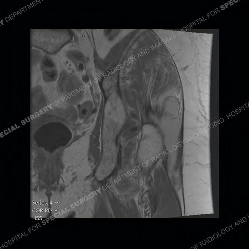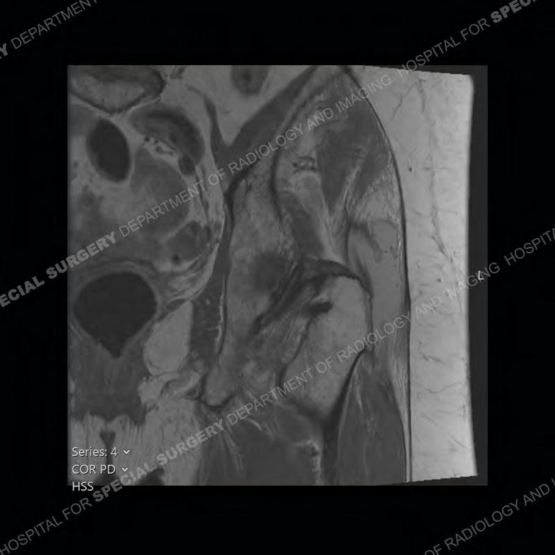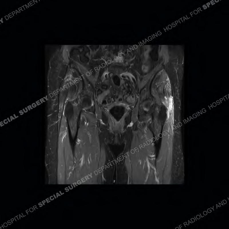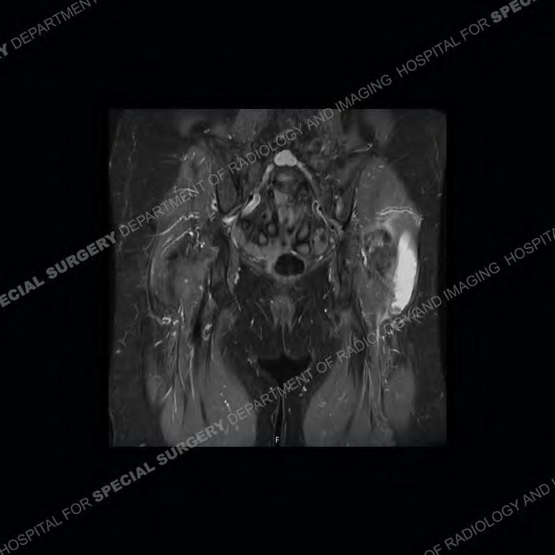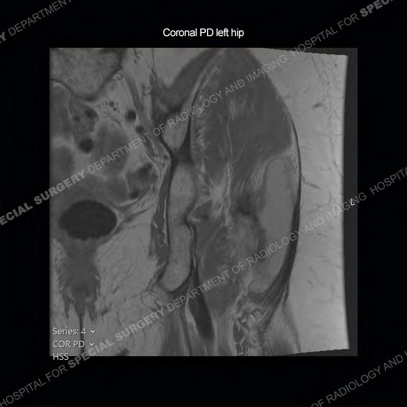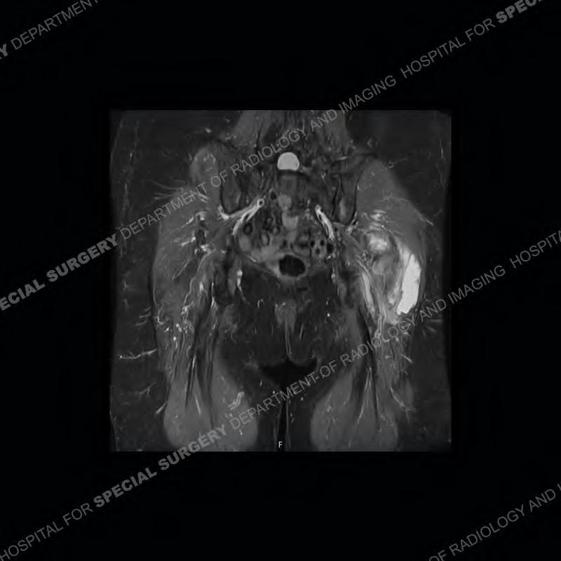 Not as much of a diagnostic dilemma as many of the other cases shown but just a nice example of the pathology seen of the gluteal tendons and a cause of trochanteric pain. Although, frequently thought of in isolation, trochanteric bursitis or bursal thickening is much more commonly a reactive change to underlying pathology of the subjacent gluteal tendons. The gluteus medius is divided into a posterior band and an anterolateral band. Tendinosis and partial tearing very commonly will involve the gluteus minimus and especially the more posterior fibers and then propagate into the anterior lateral band of the gluteus medius. Involvement of the posterior band of the medius is much less common and engenders a marked degree of functional impairment.