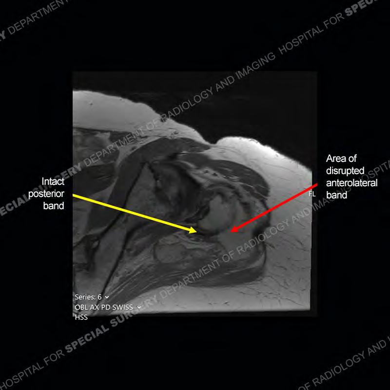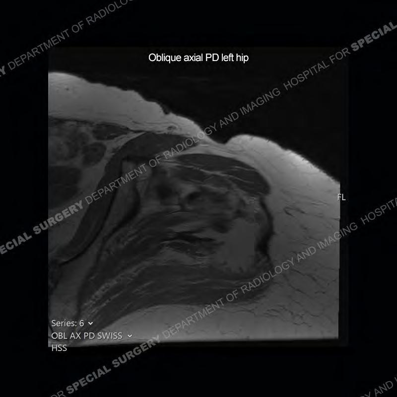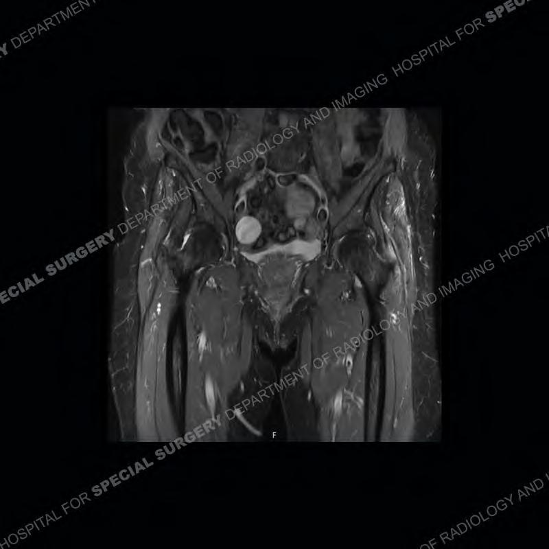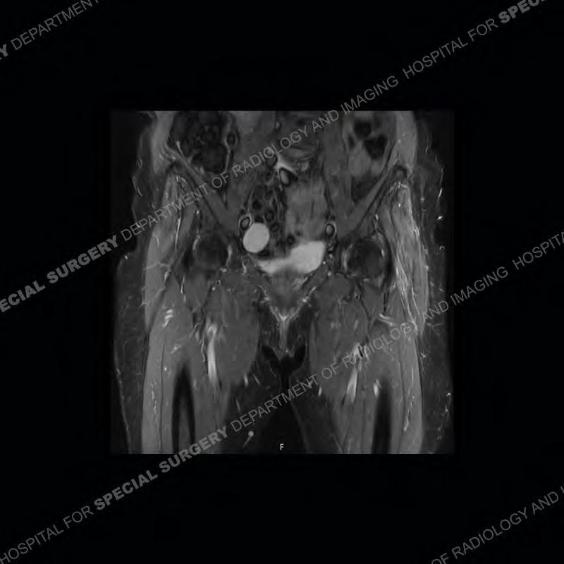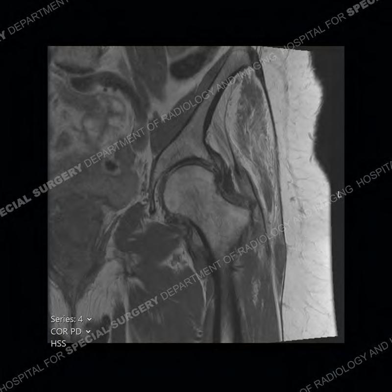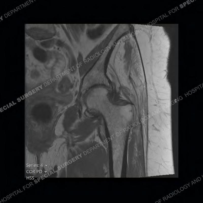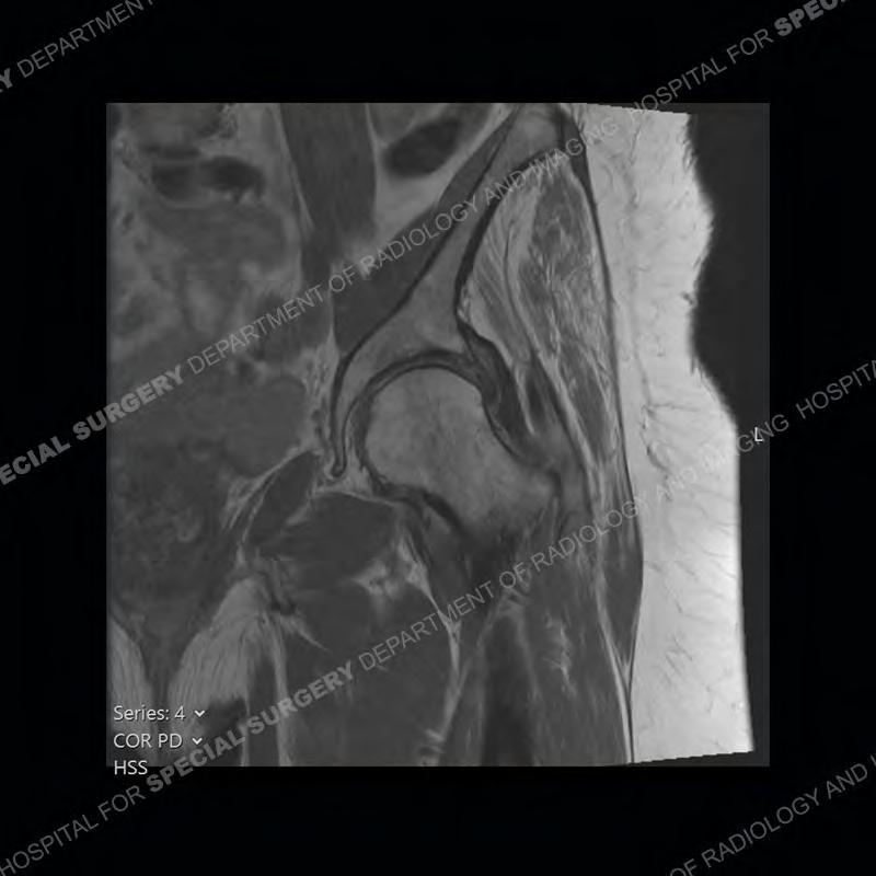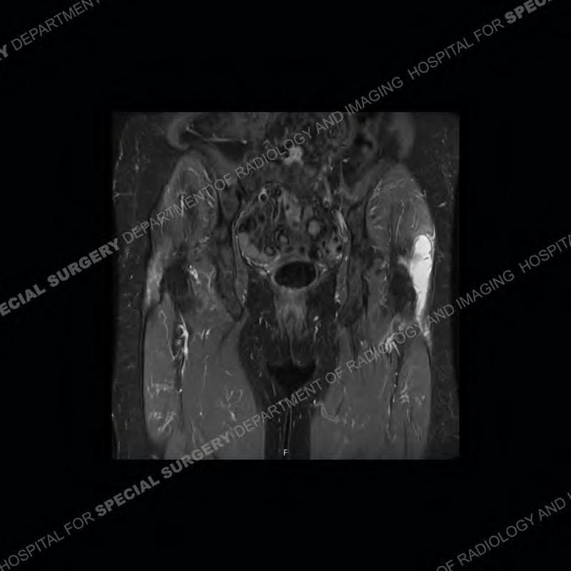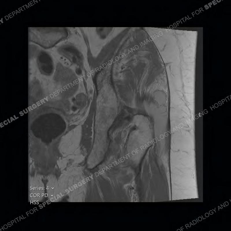 Not as much of a diagnostic dilemma as many of the other cases shown but just a nice example of the pathology seen of the gluteal tendons and a cause of trochanteric pain. Although, frequently thought of in isolation, trochanteric bursitis or bursal thickening is much more commonly a reactive change to underlying pathology of the subjacent gluteal tendons. The gluteus medius is divided into a posterior band and an anterolateral band. Tendinosis and partial tearing very commonly will involve the gluteus minimus and especially the more posterior fibers and then propagate into the anterior lateral band of the gluteus medius. Involvement of the posterior band of the medius is much less common and engenders a marked degree of functional impairment.