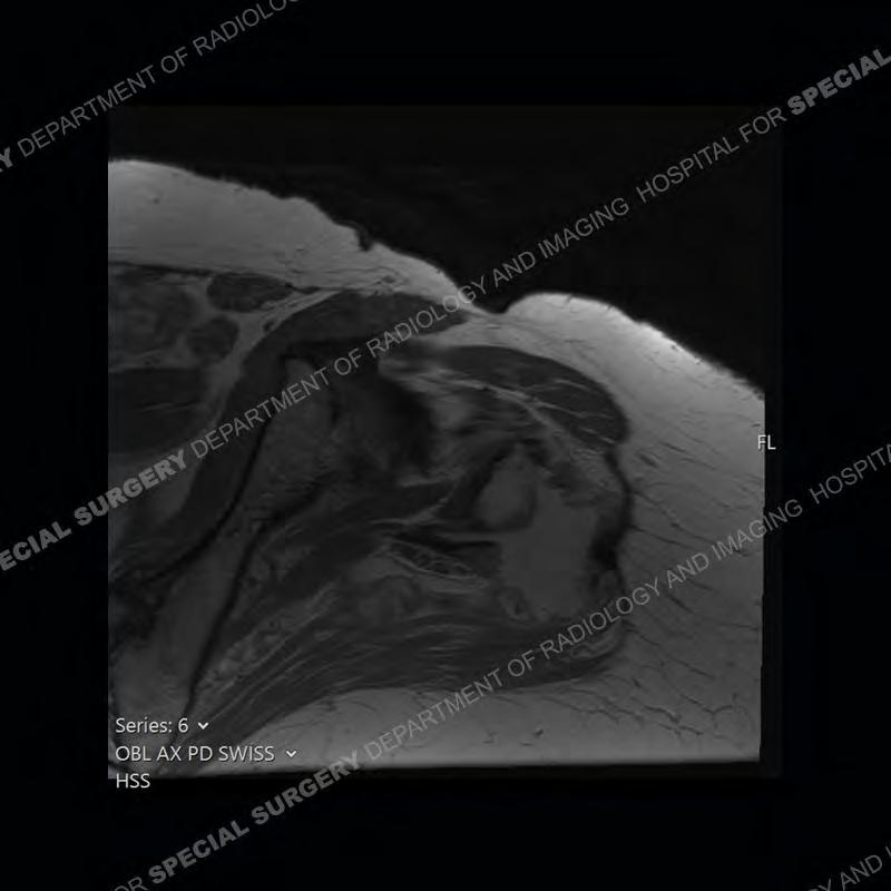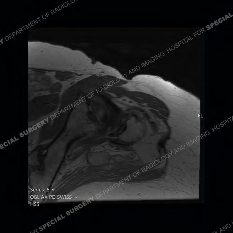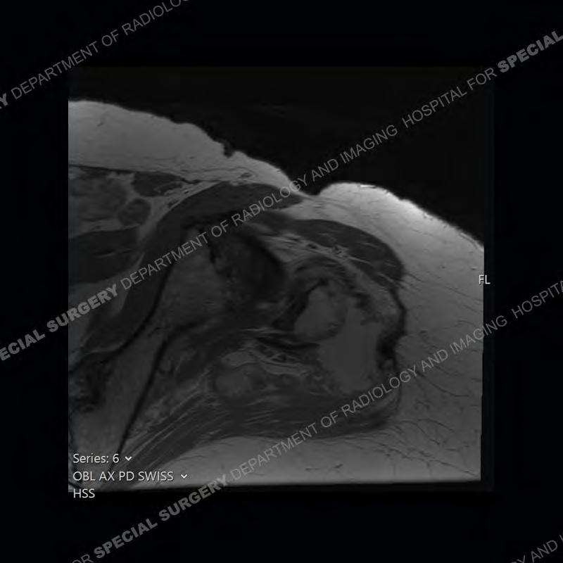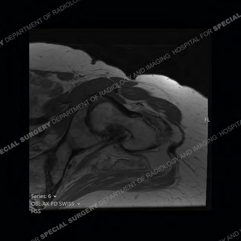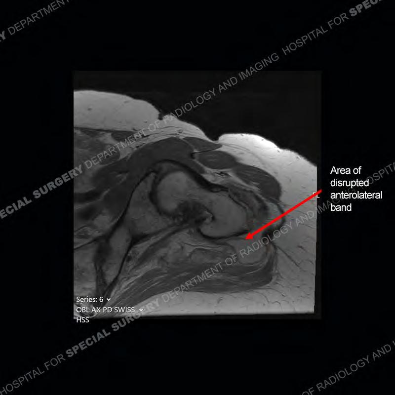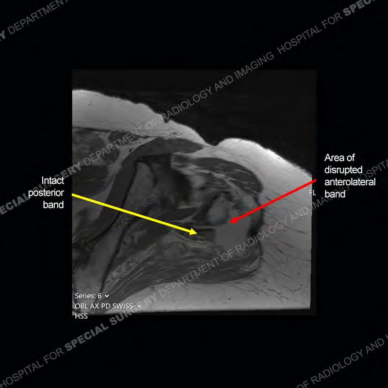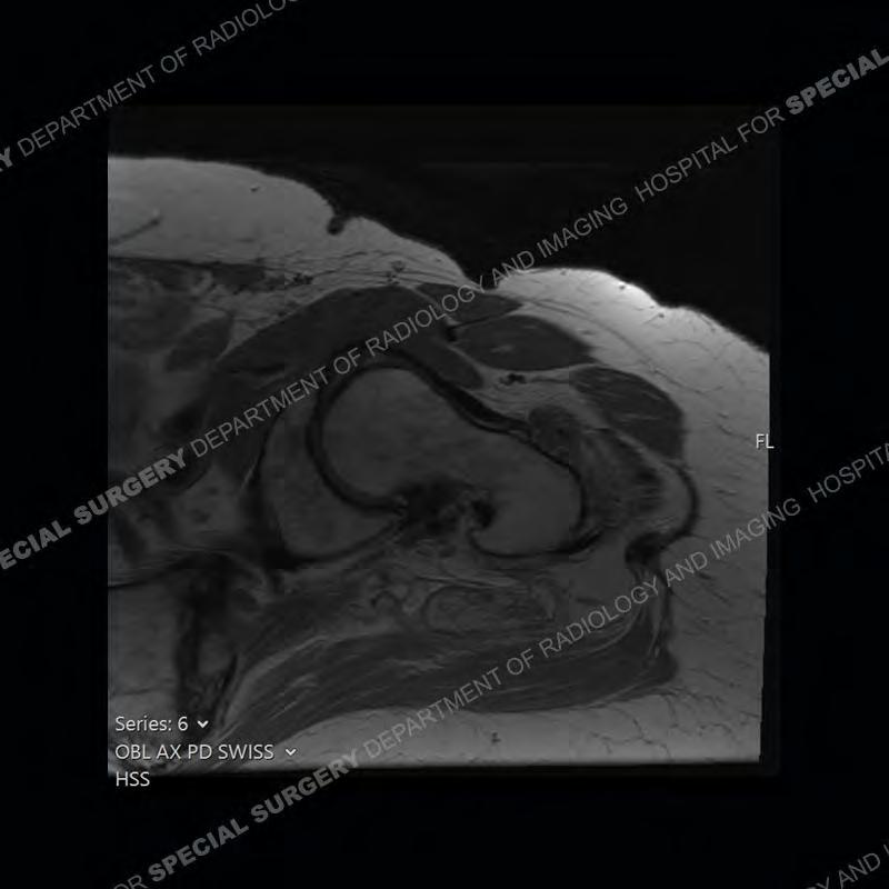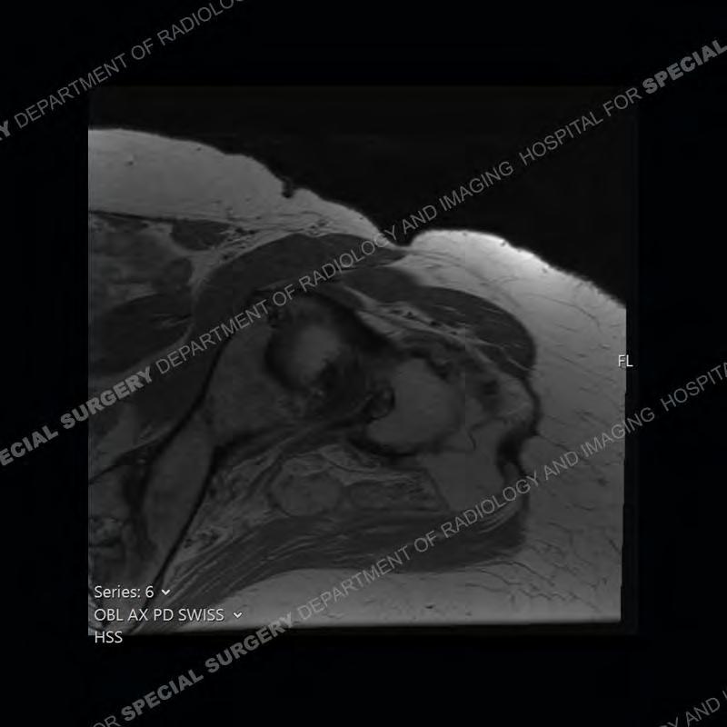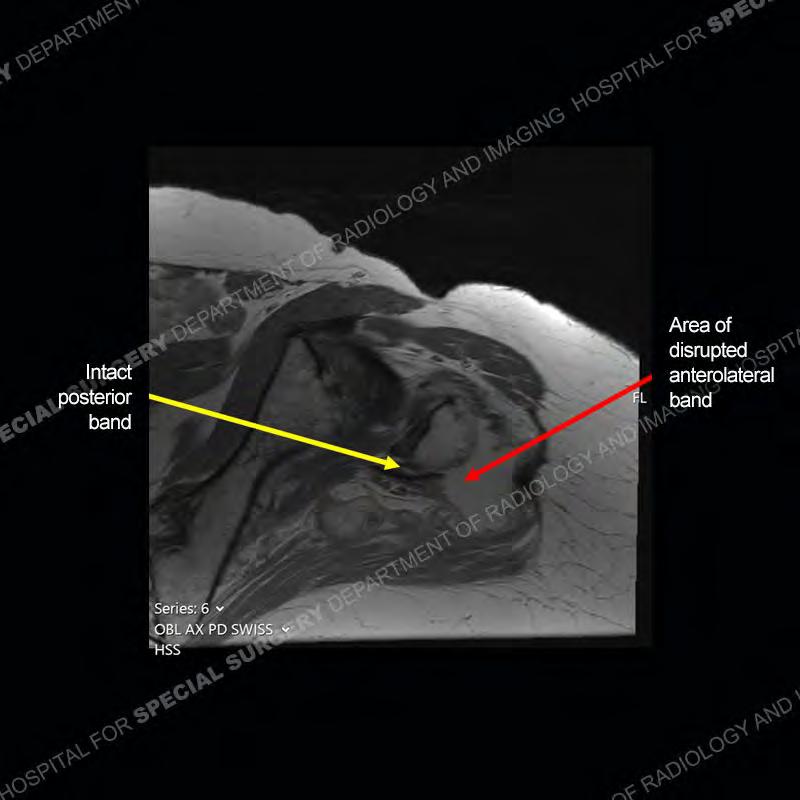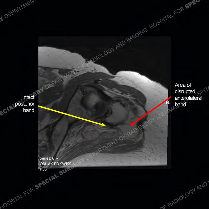Not as much of a diagnostic dilemma as many of the other cases shown but just a nice example of the pathology seen of the gluteal tendons and a cause of trochanteric pain. Although, frequently thought of in isolation, trochanteric bursitis or bursal thickening is much more commonly a reactive change to underlying pathology of the subjacent gluteal tendons. The gluteus medius is divided into a posterior band and an anterolateral band. Tendinosis and partial tearing very commonly will involve the gluteus minimus and especially the more posterior fibers and then propagate into the anterior lateral band of the gluteus medius. Involvement of the posterior band of the medius is much less common and engenders a marked degree of functional impairment.