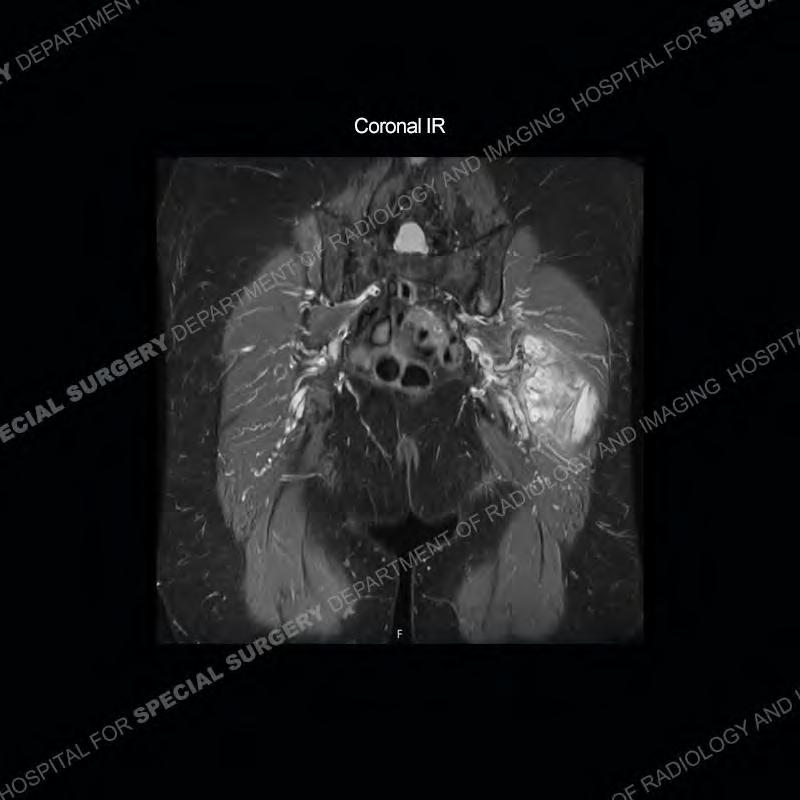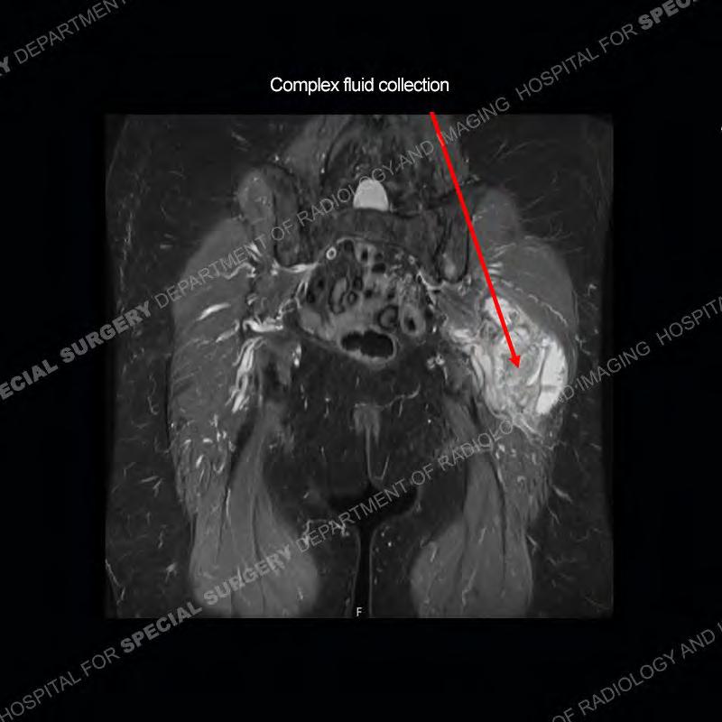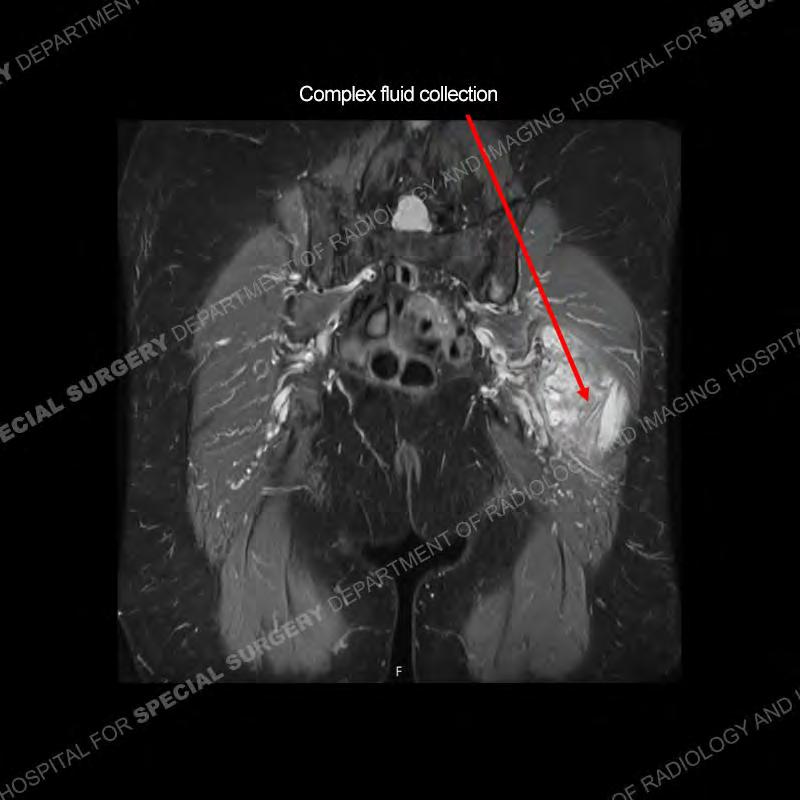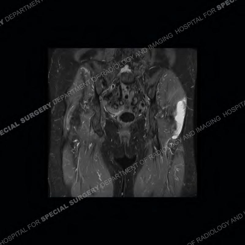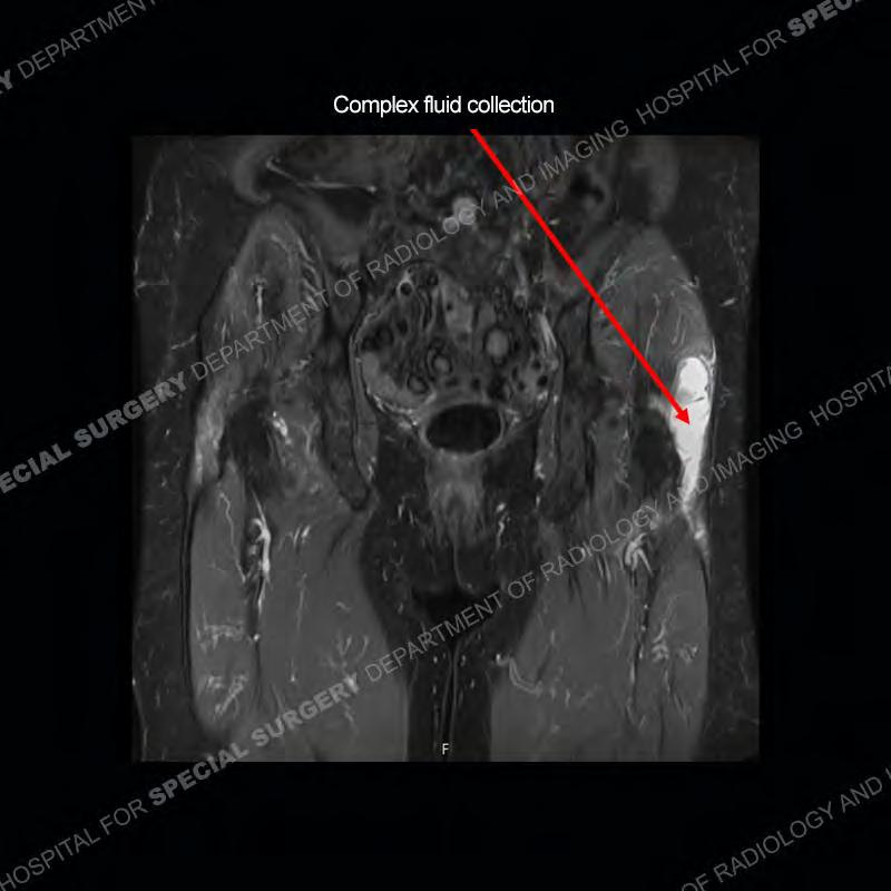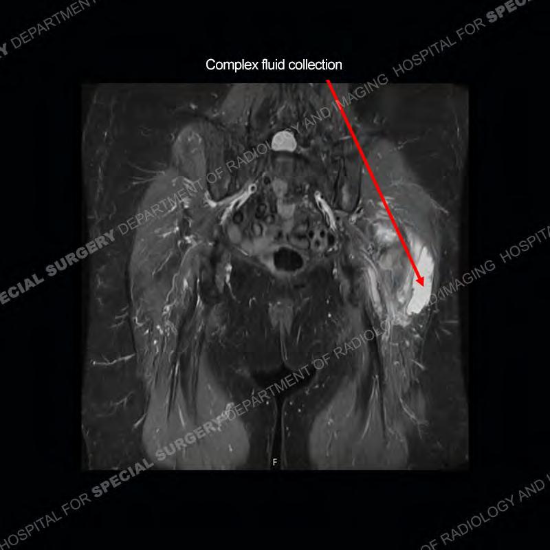 The radiograph is not particularly contributory in this case. The MRI demonstrates markedly abnormal architecture of the gluteus minimus and anterolateral band of the gluteus medius. Portions of the tendons are high signal, portions are highly attenuated, and portions are disrupted. A large, complex fluid collection is present in the adjacent soft tissue.