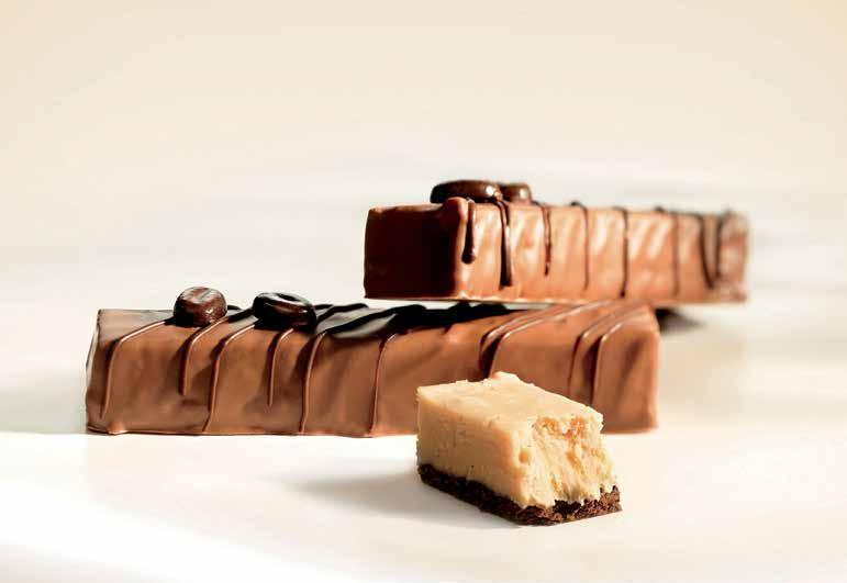 Remove the frame once the entire mixture is hard and cut into bars. Enrobe the bars with melted Callebaut Milk Chocolate 823. Decorate with a line of Callebaut Dark Chocolate 811. Leave to harden.