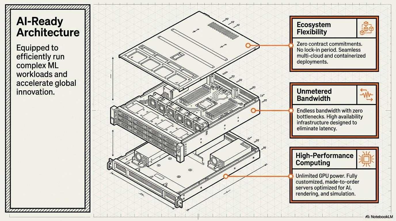 Equipped with AI-ready architecture, the platform speeds up innovation while providing high-performing efficiency. This facilitates zero contract liabilities, no vendor lock-in and thus allows businesses extensibility to scale across multi-cloud & containerized environments Bandwith unmetered also boosts performance and ensures a network bottless neck-free-serves high-performance, always on, low-latency connections.