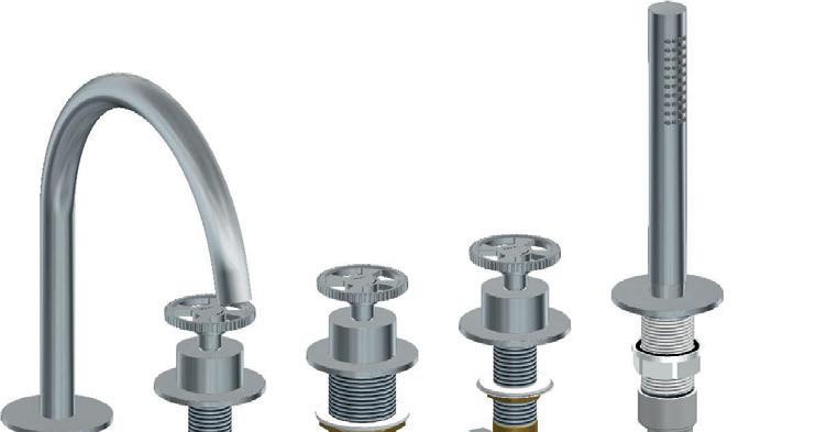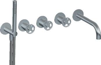 5 gats badrandcombinatie, 2 knops mengkraan, omstel en handdouche Deck-mounted mixer for bathtub, with swivel spout and handshower Mitigeur de baignore pour montage sur gorge, avec bec mobile et douchette Wannenbatterie für Randmontage, mit Schwenkauslauf und Handbrause