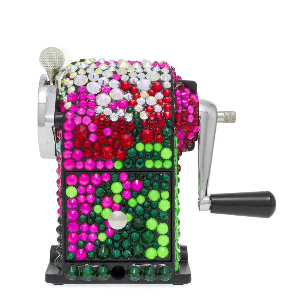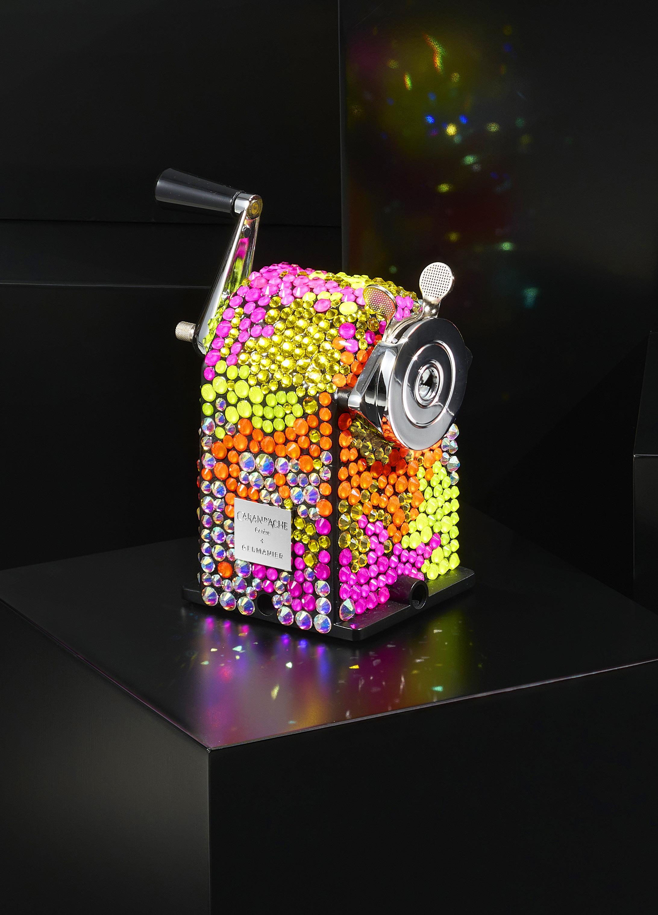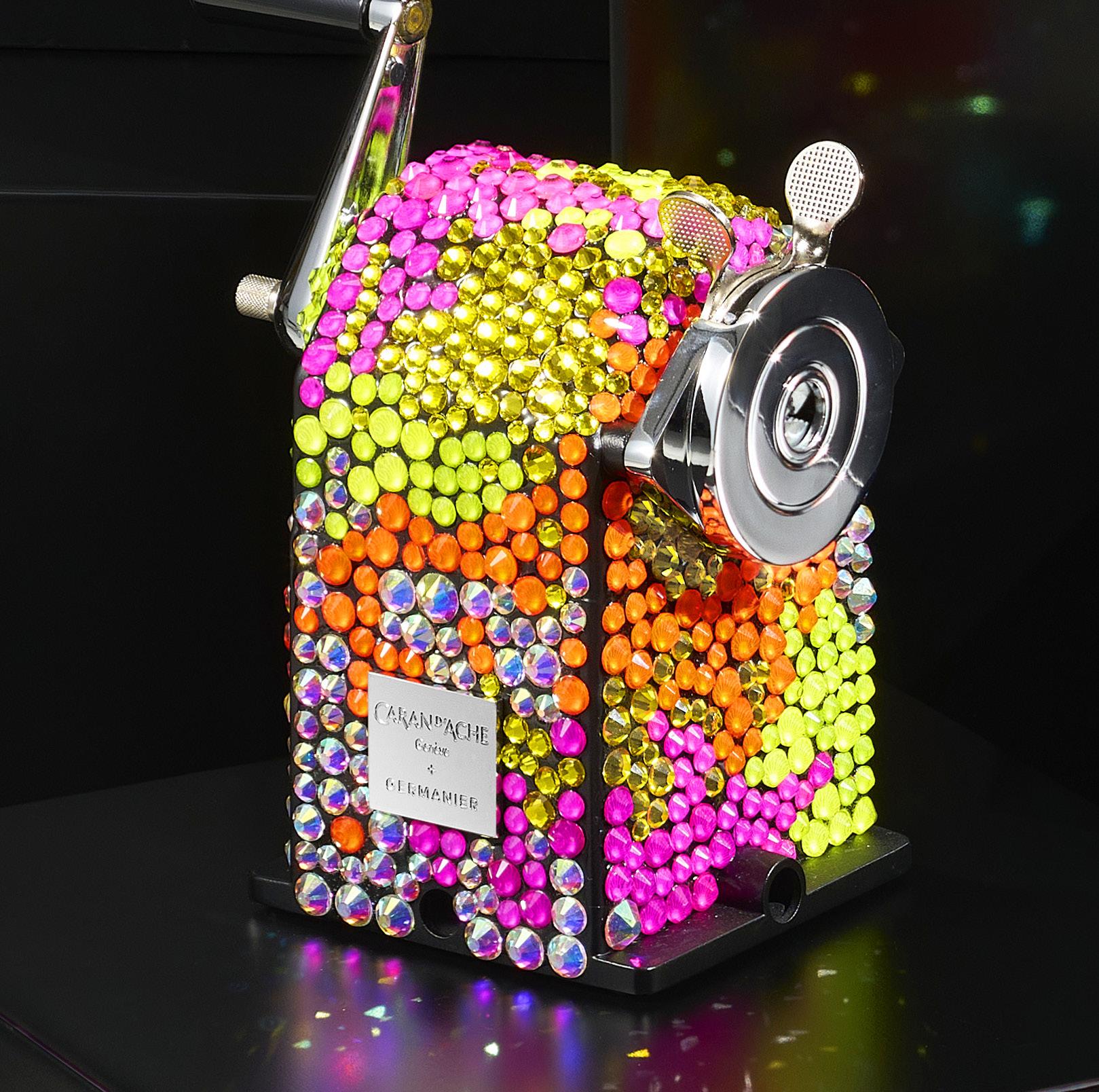 2910. Caran d’Ache & Germanier, Les Fulgureuses, Infra Rose, pièce unique, machine à tailler recouverte de 1000 cristaux de couleur rouge rubis, vert émeraude, ainsi que vert et rose fluo. Fourni avec la pièce d’exception: un certificat d’authenticité signé par Carole Hubscher, présidente de Caran d’Ache, et par Kévin Germanier, numérotée 1/1; un écrin sur mesure; une surboîte; serre-joint permettant de fixer à une table; tissus de nettoyage