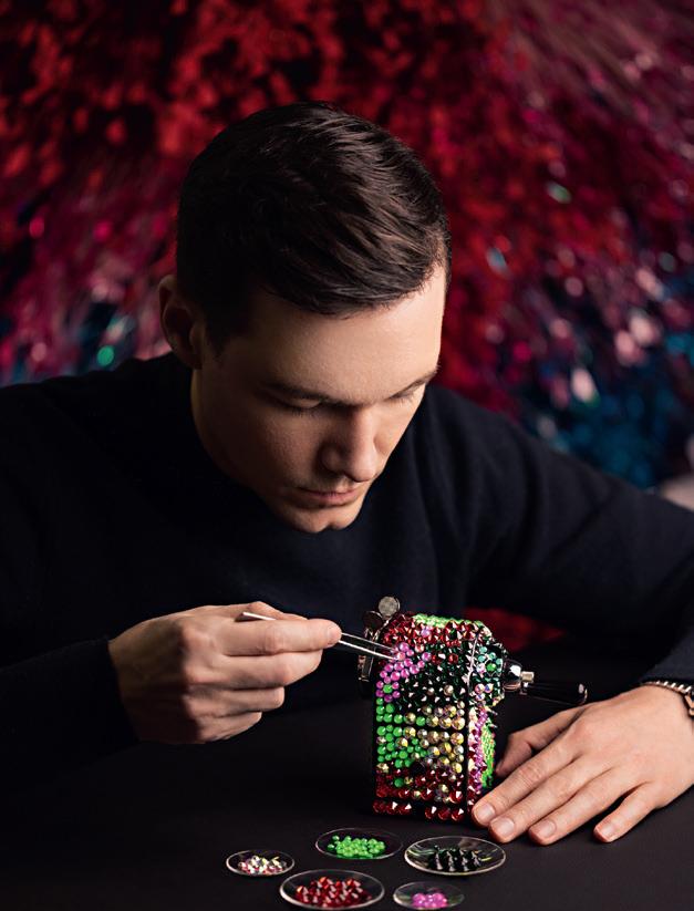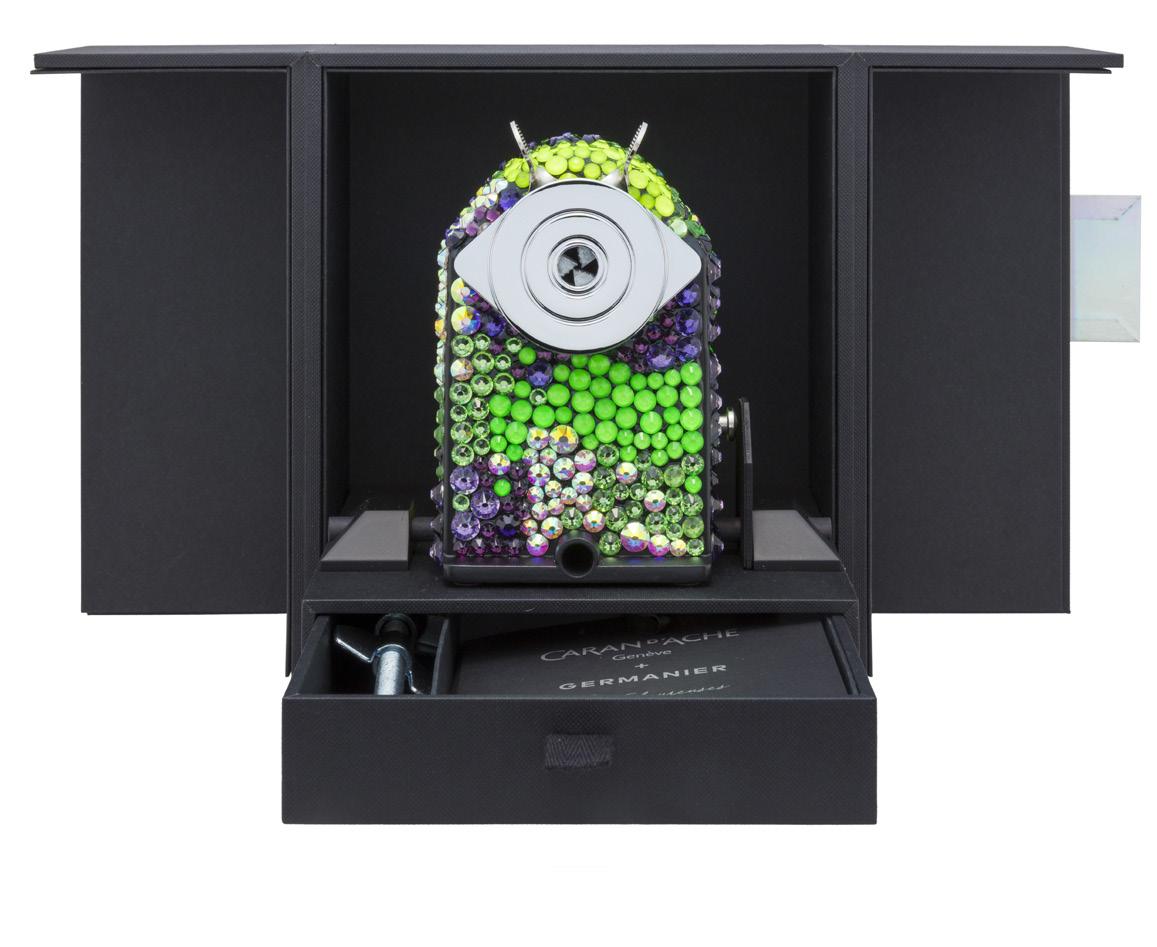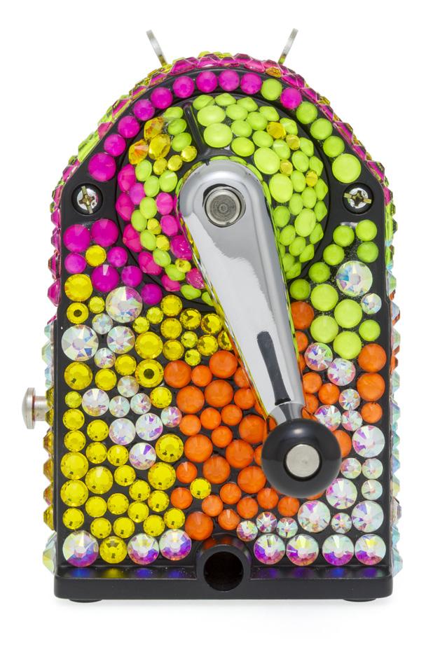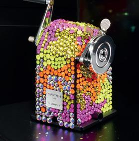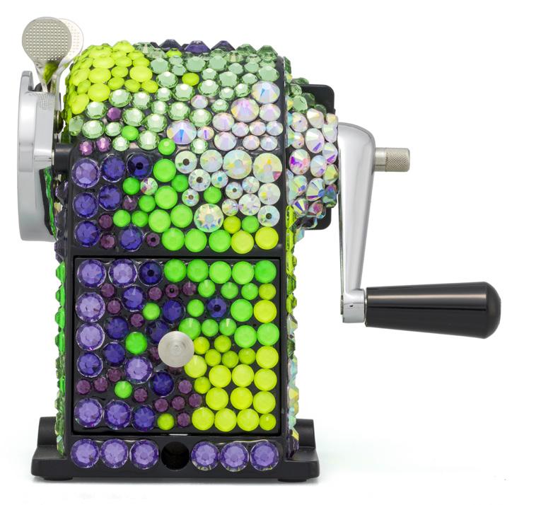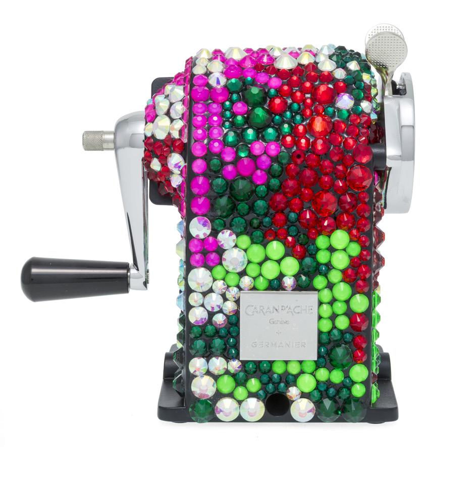 unique de machine à tailler en métal, modèle produit depuis 1933, est ici entièrement rhabillée de 1000 cristaux appliqués à la main dans une palette de couleurs Ultra Violet Seulement trois machines à tailler ont été réalisées pour la collection «Les Fulgureuses», chacune unique par sa palette de couleurs éclatantes. Présentée dans un écrin spécial, conçu comme un coffre précieux, réalisé sur mesure, cette pièce dépasse sa fonction utilitaire pour devenir une véritable œuvre d’art, reflet d’un savoirfaire d’exception et d’une vision contemporaine de l’objet iconique. 3.000-5.000