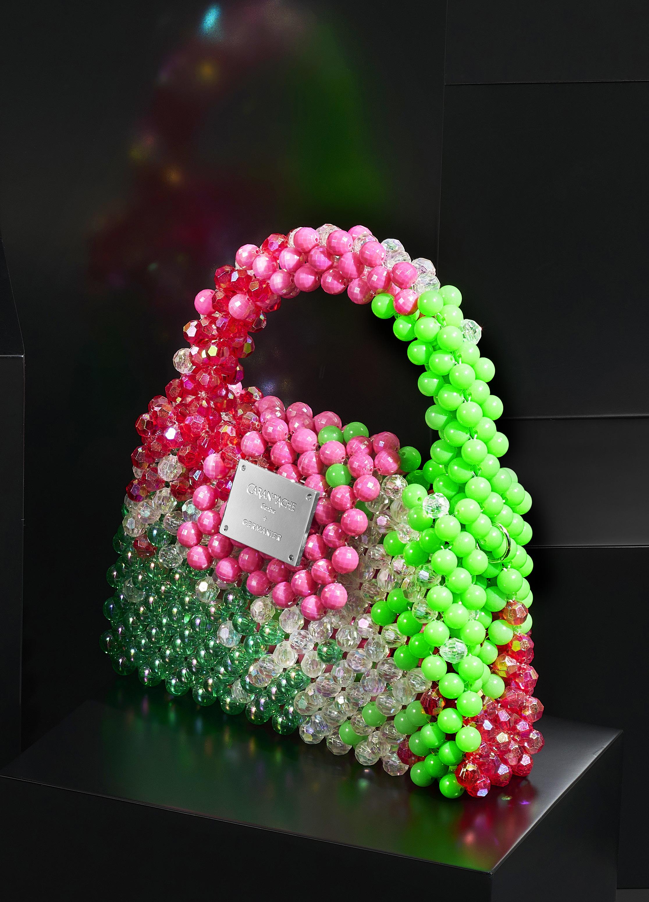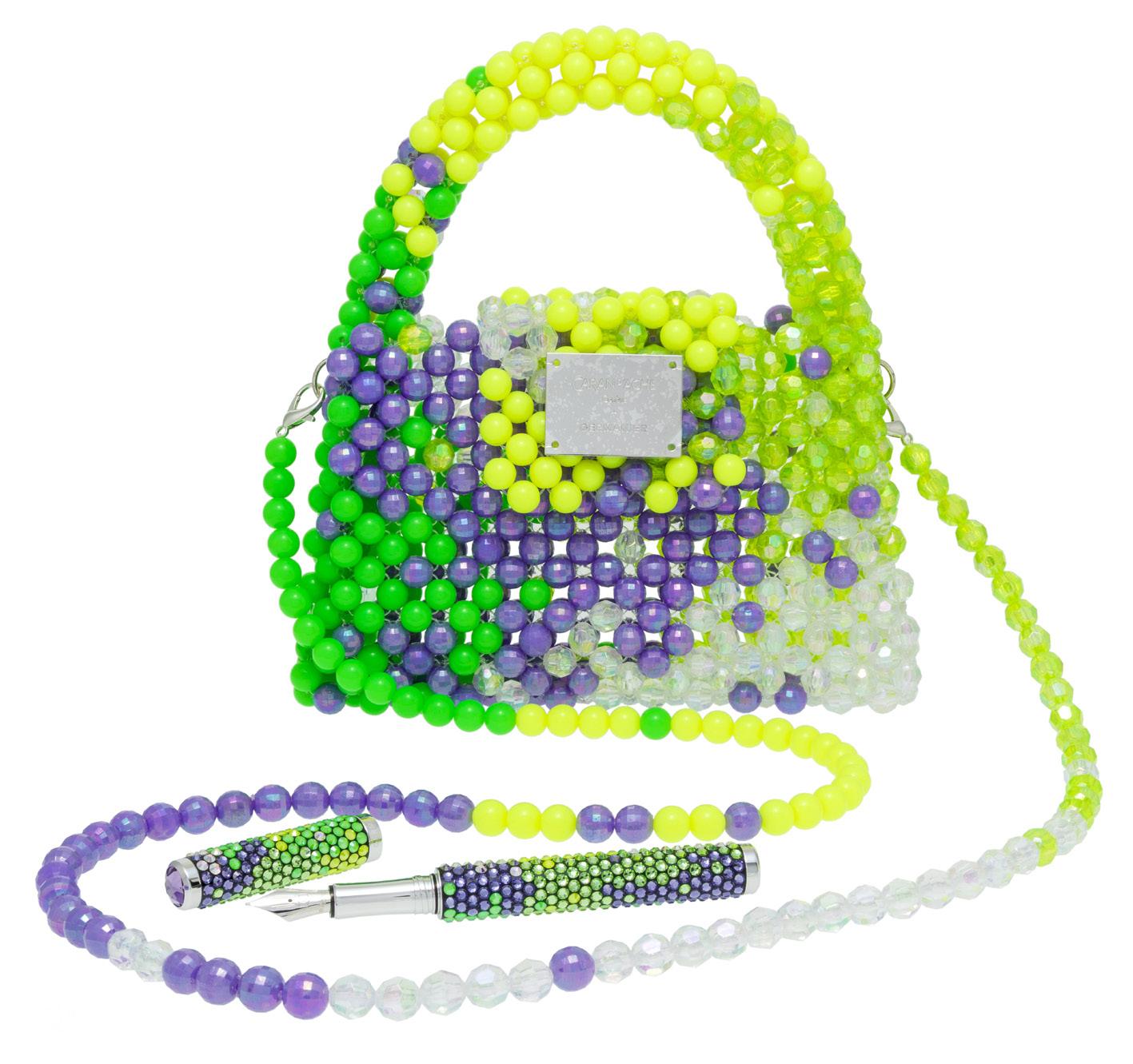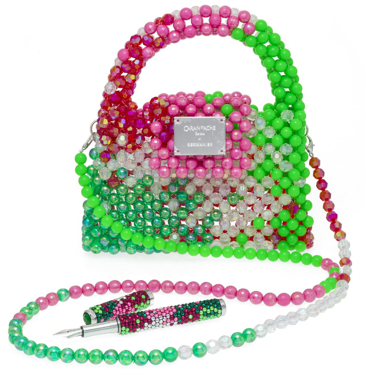 2908. Caran d’Ache & Germanier, Les Fulgureuses, Infra Rose, pièces uniques, ensemble composé d’un instrument de haute écriture, stylo plume serti d’une agate verte taille brillant de 2.59 cts et de 528 cristaux accompagné de son sac assorti tissé de perles de couleur rouge rubis, vert émeraude, ainsi que vert et rose fluo avec bandoulière amovible. Fourni avec la pièce d’exception: un certificat d’authenticité signé par Carole Hubscher, présidente de Caran d’Ache, et par Kévin Germanier, numérotée 1/1; un certificat pour l’agate verte; un pochon noir revêtu de cristaux de verre; un écrin sur mesure; une surboîte; un tissu de nettoyage