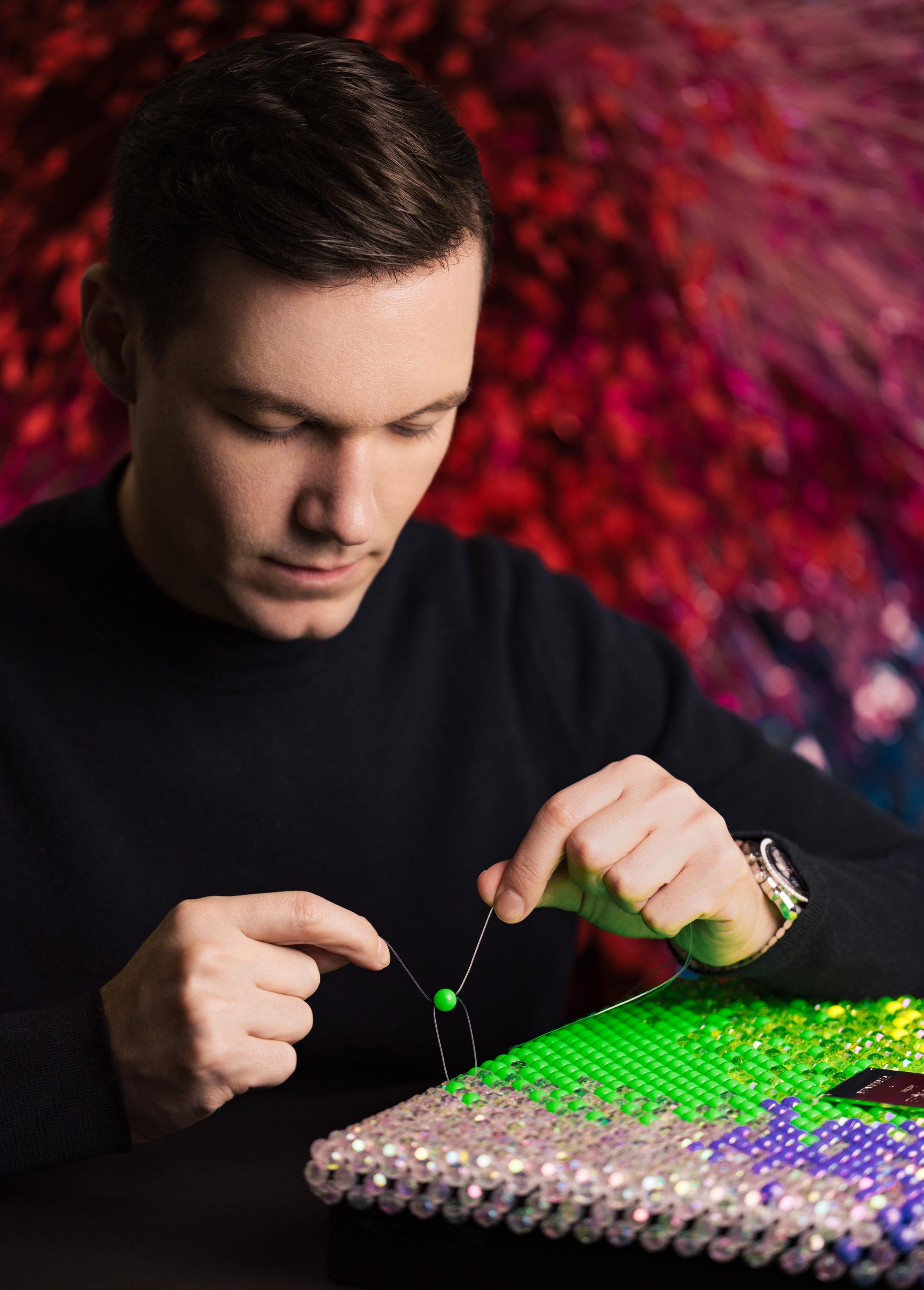 2909. Caran d’Ache & Germanier, Les Fulgureuses, Infra Rose, pièce unique, coffret de 120 crayons de couleur dans leur écrin sur mesure habillé de plus de 1500 perles tissées à la main de couleur rouge rubis, vert émeraude, ainsi que vert et rose fluo. Fourni avec la pièce d’exception: un certificat d’authenticité signé par Carole Hubscher, présidente de Caran d’Ache, et par Kévin Germanier, numérotée 1/1; écrin sur mesure; une surboîte; tissus de nettoyage