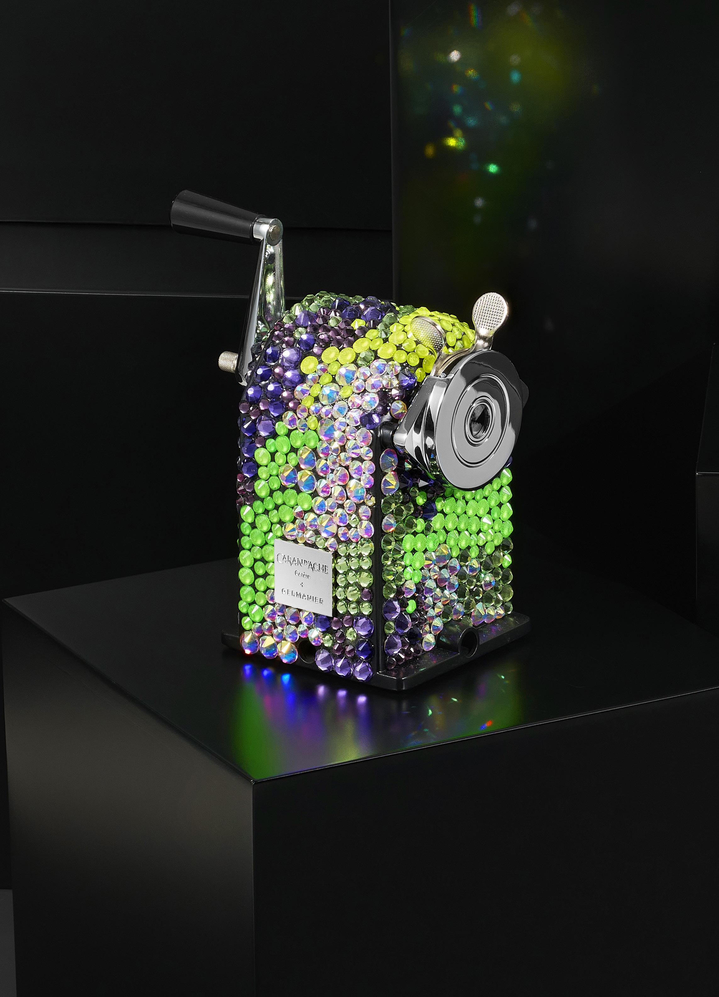 2907. Caran d’Ache & Germanier, Les Fulgureuses, Ultra Violet, pièce unique, machine à tailler recouverte de 1000 cristaux de couleur vert péridot, vert et jaune fluo, ainsi que mauve. Fourni avec la pièce d’exception: un certificat d’authenticité signé par Carole Hubscher, présidente de Caran d’Ache, et par Kévin Germanier, numérotée 1/1; un écrin sur mesure; une surboîte; serre-joint permettant de fixer à une table; tissus de nettoyage La collection «Les Fulgureuses» est née de la collaboration entre Caran d’Ache et Kévin Germanier. Kévin Germanier est un créateur de mode suisse de renommée internationale, reconnu pour son approche innovante et durable du luxe. Il a notamment réalisé les costumes pour la cérémonie de clôture des