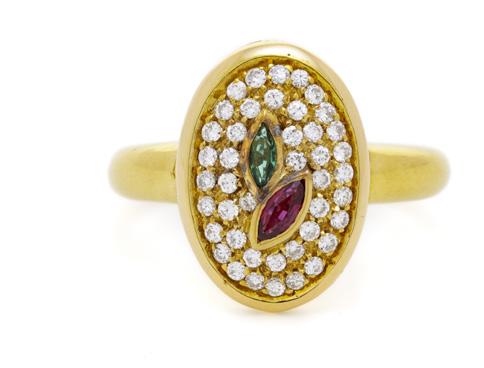 3631. Bague or 750 orné d’un centre ovale serti d’une émeraude et d’un rubis marquise entourés de diamants taille brillant, doigt 54-14, 5g