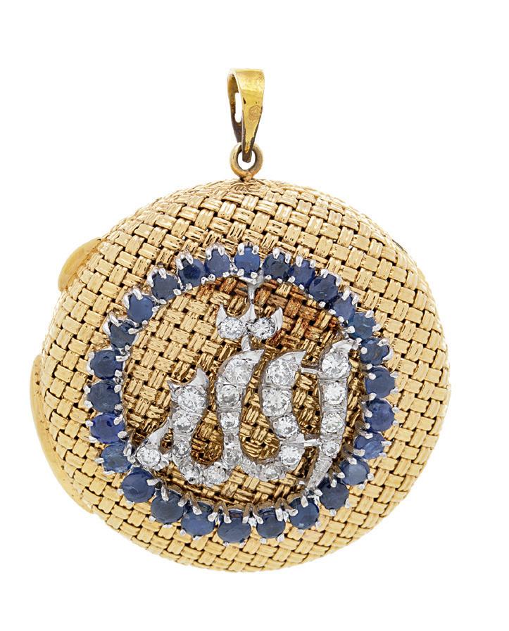 3611. Pendentif-médaillon or 750 tressé orné du nom «Allah» serti de diamants dans un entourage de saphirs, renfermant un exemplaire du Coran miniature 1.500-2.500