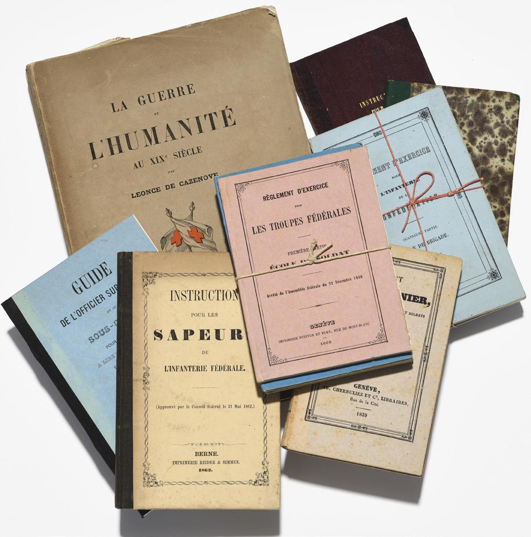 3167. [Général Dufour]. MILI TARIA. Ensemble de 13 vol. de manuels, carnets et publications à thématique militaire, certains avec hommage des auteurs au général Dufour, et l’un portant son ex-libris manuscrit. Divers formats, reliures illustrées des éditeurs.