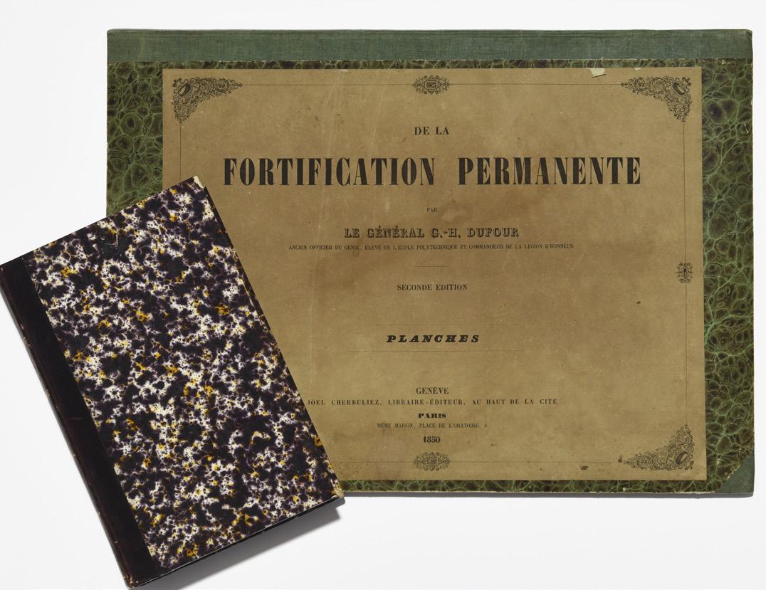 3165. [Général Dufour]. DUFOUR (G.H.) De la fortification permanente. Genève, Joël Cherbuliez, 1850. 1 vol. de texte in-8° relié demi-basane violette, dos lisse orné et doré et 1 vol. d’atlas in-4° oblong relié demi-percaline verte à coins (Reliure de l’époque). 506 pp. Orné de 35 planches dont 34 numérotées et 1 supplémentaire dans l’atlas.