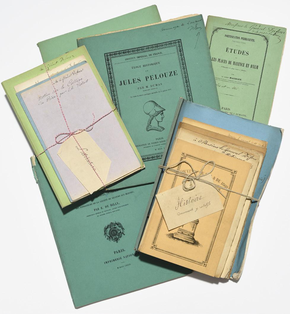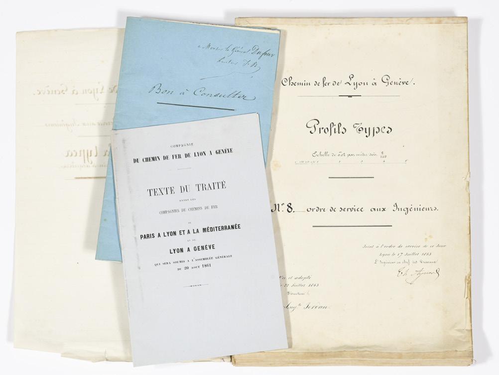 3161. [Général Dufour]. DOCU MENTATION. Important ensemble de fascicules et ouvrages de sujets divers adressés par les auteurs, éditeurs et autres au Général Dufour. Tous en brochages d’édi teurs tels que parus au XIXe siècle. Le foisonnement de ces publica tions témoignent de l’importance que G.H. Dufour accordait à l’étude tant scientifiques que littéraires et ce sur des sujets très variés mais toujours en liens avec les avancées techniques, politiques ou encore socio-économiques de l›Europe du XIXe s. Sa curiosité et connaissance pluridisciplinaire le firent présider la Société des Arts de Genève. Les multiples envois des auteurs de ces publications mettent en lumières l’importance du Général dans les productions intellectuelles de cette période et de son autorité sur ses disciplines de prédilection. Provenance : resté dans la famille du général par descendance, puis vendu par les héritiers à l’actuel propriétaire en 2012 200-300 3162. [Général Dufour]. Ensemble de documents sur la création de la ligne de chemin de fer Lyon-Genève entre 1852 et 1861, comprenant: 1) une argu mentation de Francisque Bouvet avec un envoi au Général Dufour «De l’importance des chemins de fer aux frontières»; 2) le texte du traité entre les compagnies de che min de fer de Paris à Lyon et à la Méditerranée et de Lyon à Genève de 1861; 3) le tracé des courbes 4) L’ordre de service aux ingénieurs pour le Profila typea illustré de 11 cartes traitant de la largeur des terrains à acquérir pour le passage de la voie ferrée. Certaines de ces cartes sont annotées de commen taires et chiffres au crayon à papier Intéressants documents du Général Dufour qui fut un des fondateurs de la compagnie de chemin de fer Lyon-Genève, et qui fut mandaté pour la planification de la construc tion de la ligne Provenance : resté dans la famille du général par descendance, puis vendu par les héritiers à l’actuel propriétaire en 2012 200-300