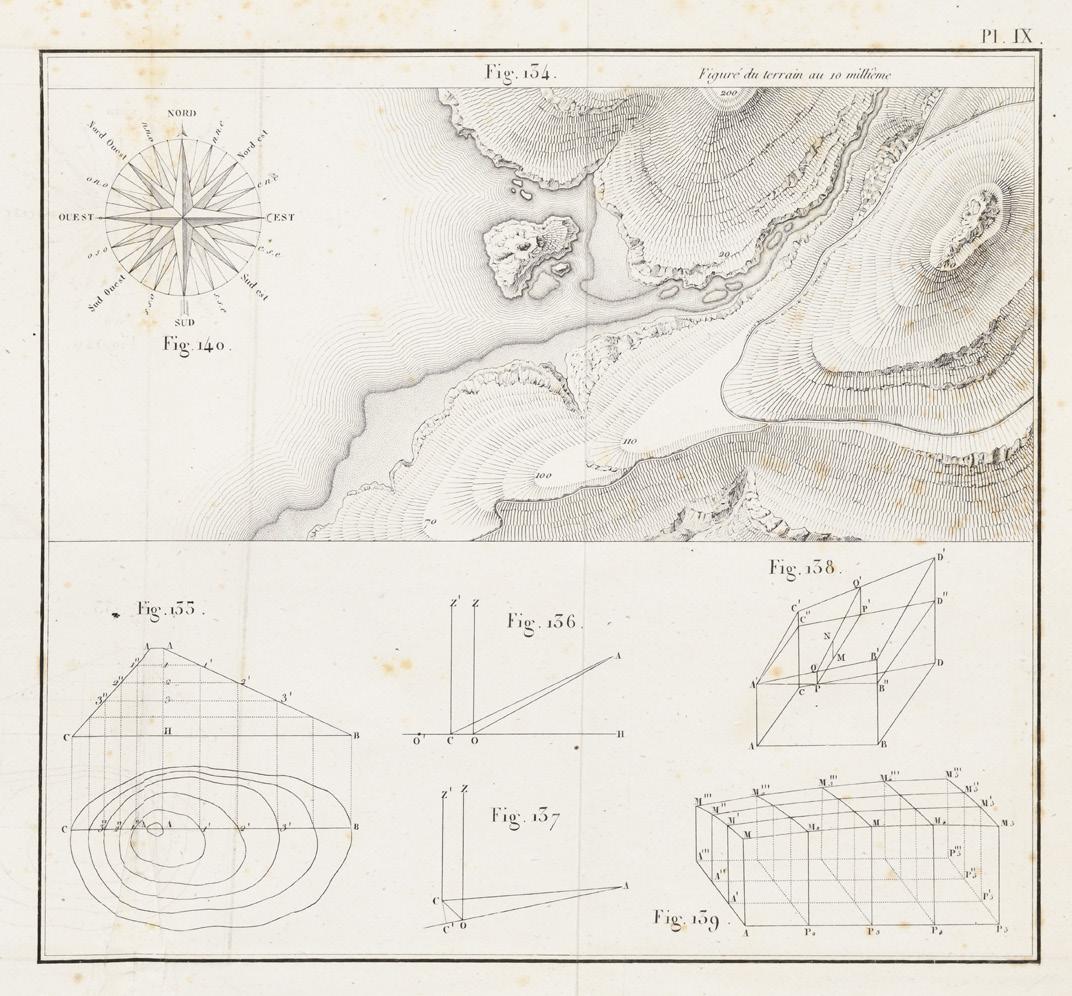 3173. [Général Dufour]. PUIS SANT (Louis). Traité de topographie d’arpentage et de nivellement. Paris, Mme Courcier, 1820. In-4° relié demi-basane blonde, dos lisse orné de filet doré, ex-libris doré en queue, reliure recouverte d’une toile (Reliure de l’époque). Orné de 9 planches dépliantes numérotées montées en fin d’ouvrage. Seconde édition de ce traité de topographie, nouvelle science introduite au XIXe s. qui passionna H.G. Dufour lors de son cursus du Génie à Metz. Qlqs petites rousseurs au texte et aux planches Ex-libris en queue du dos de H. Lhardy, ingénieur géographe suisse qui collabora avec Dufour sur les relevés topographiques pour la carte de la Suisse notamment dans l’est montagneux du Valais.