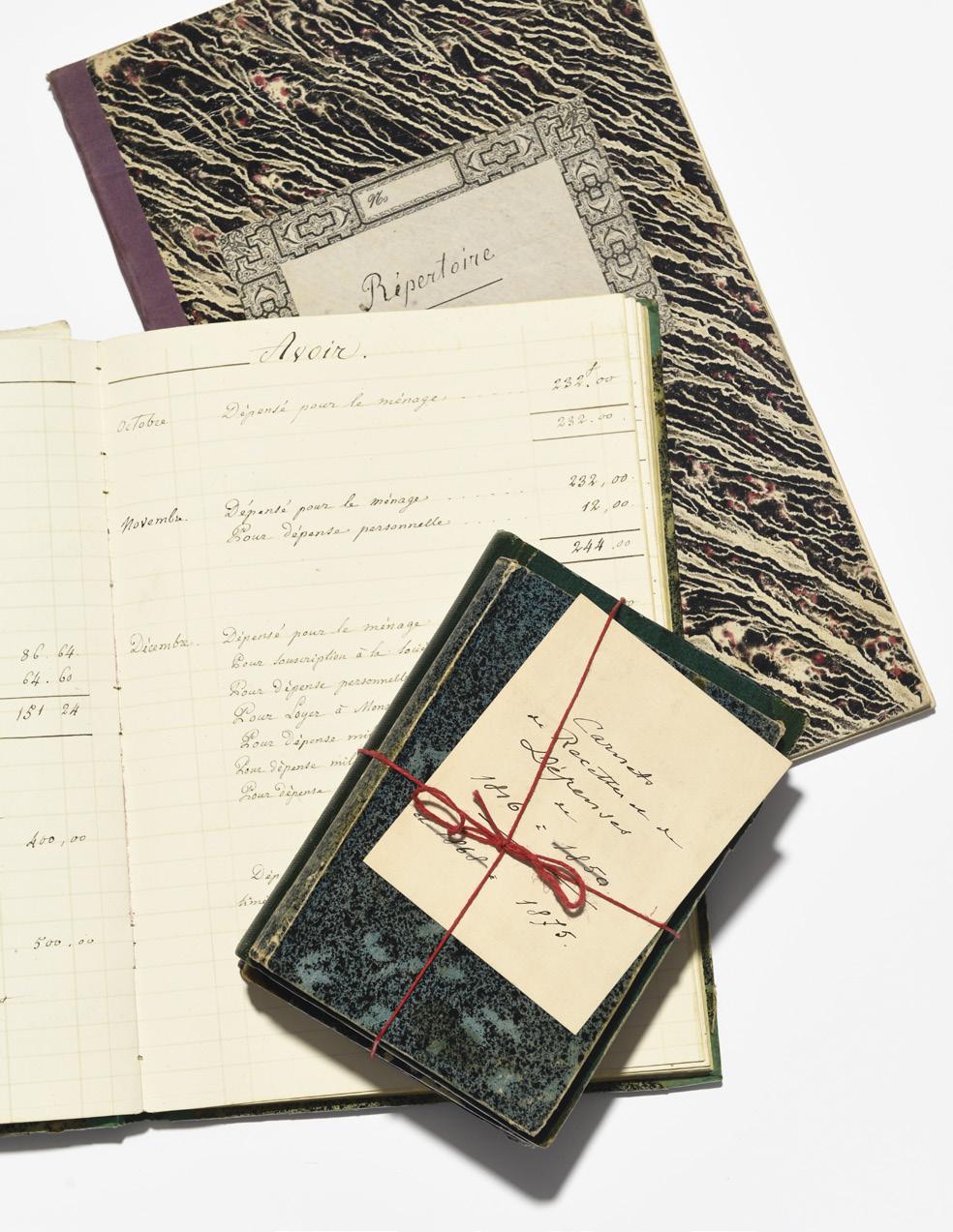 3159. [Général Dufour]. Comp tabilité personnelle. 4 petits carnets de recettes et dépenses de 1816 à [1875] et un carnet in-4° reprenant les recettes et dépenses de manières globales pour les années de 1820 à 1874 et 1 carnets grand in-8° des titres détenus par le Général, tenus par M. Richard Pictet en décembre 1874. Le tou manuscrit probable ment de la mains de G.H. Dufour qui a apposé sa signature à un envoi en début du carnet de titres expliquant que d’autres sommes sont détenues ailleurs. Unique ensemble qui retrace la comptabilité du foyer du Général tant dans les dépenses quoti diennes que celles singulières et d’autres périodes ou les frais furent assuré par la confédération comme signifié avec soin. Jusqu’en 1839, année où le général se sépare du domaine, la comptabilité de Mon trottier est elle aussi mentionnée par endroits.