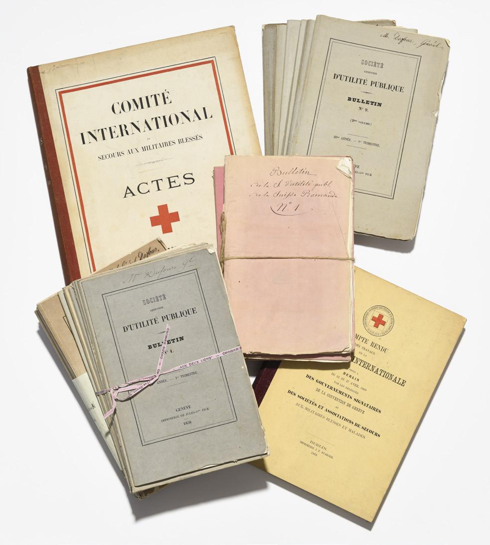 3160. [Général Dufour]. CROIX ROUGE - SGUP. ensemble de 2 ouvrages sur la croix rouge et une quarantaine de fascicules des bulle tins de la SGUP de diverses années adressées au général Dufour datant de la seconde moitié du XIXe s. Le Général Dufour s’impliqua dans la Société Genevoise d’Utilité Publique de manière pérenne: luimême et quatre autres membres de la SGUP fondèrent le comité inter national de la Croix-Rouge en 1863 et il présida le congrès de Genève de 1864 pour trouver un accord sur le secours aux victimes de la guerre.