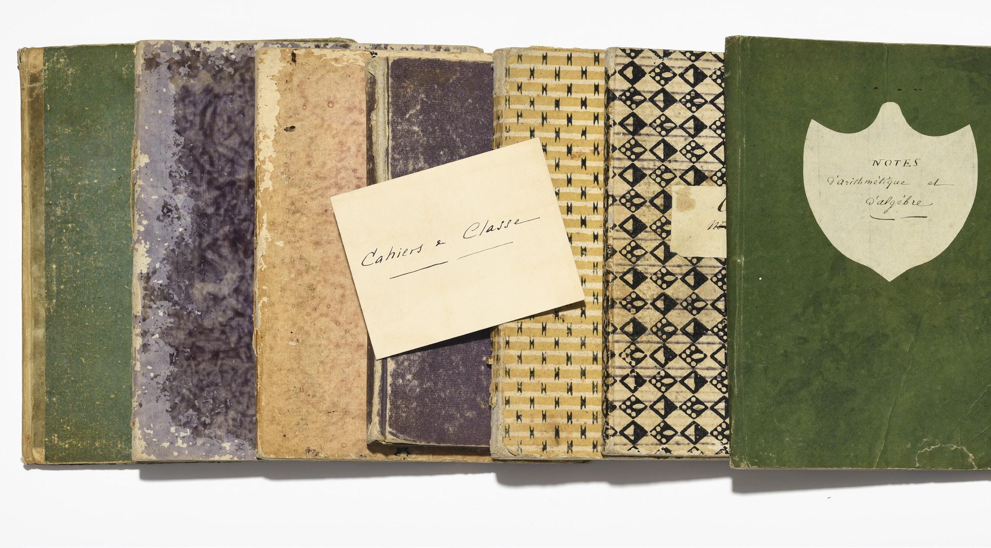 3164. [Général Dufour]. Souve nirs scolaires du général Dufour. Ensemble de 7 cahiers manuscrits scolaire brochés et 3 manuels imprimés de cours de l’Ecole des Arts et Manufactures. Les sept carnets conservés datent de l’époque où G.H. Dufour suivit des enseignement de l’Acadé mie de Genève, certains portent les datent des années suivies. L’ensemble porte sur divers ensei gnements mathématiques mais aussi anatomiques ou encore litté raires qui lui donneront le goût de poursuivre sa formation technique à l’École Polytechnique de Paris.