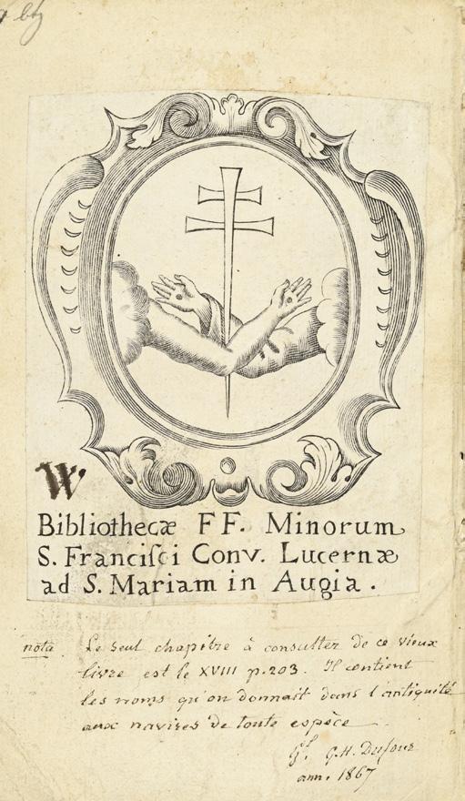 3168. [Général Dufour]. Ensemble de 2 ouvrages concernant la thématique militaria antique avec une appréciation manuscrite signée du général en début d’ouvrage quant à la qualité scientifique de ces différents textes : 1) [GIRALDI]. Lilii Gregorii Gyraldi Ferrariensis, de re nautica libellus, admiranda quadam & recondita eruditione refertus... Basileae [Bâle], Mich. Isingrinium, 1540. In-12 relié d’une ancienne page de manuscrit à pas sages vermillons. [3] ff., 306 pp. Ex-libris armorié de «Bibliothecae FF. Minorum S. Francisci Conv. Lucernae ad S. Mariam in Augia» et celui manuscrit de [Ritziani ?] daté de 1515.