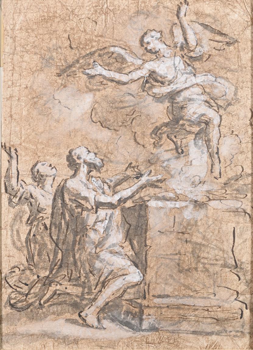2638. Étienne Parrocel (1696-1775), Sacrifice de Manué, plume et encre brune, lavis brun, rehauts de blanc sur papier préparé d’ocre, filigrane soleil dans un cercle, 26x18,5 cm