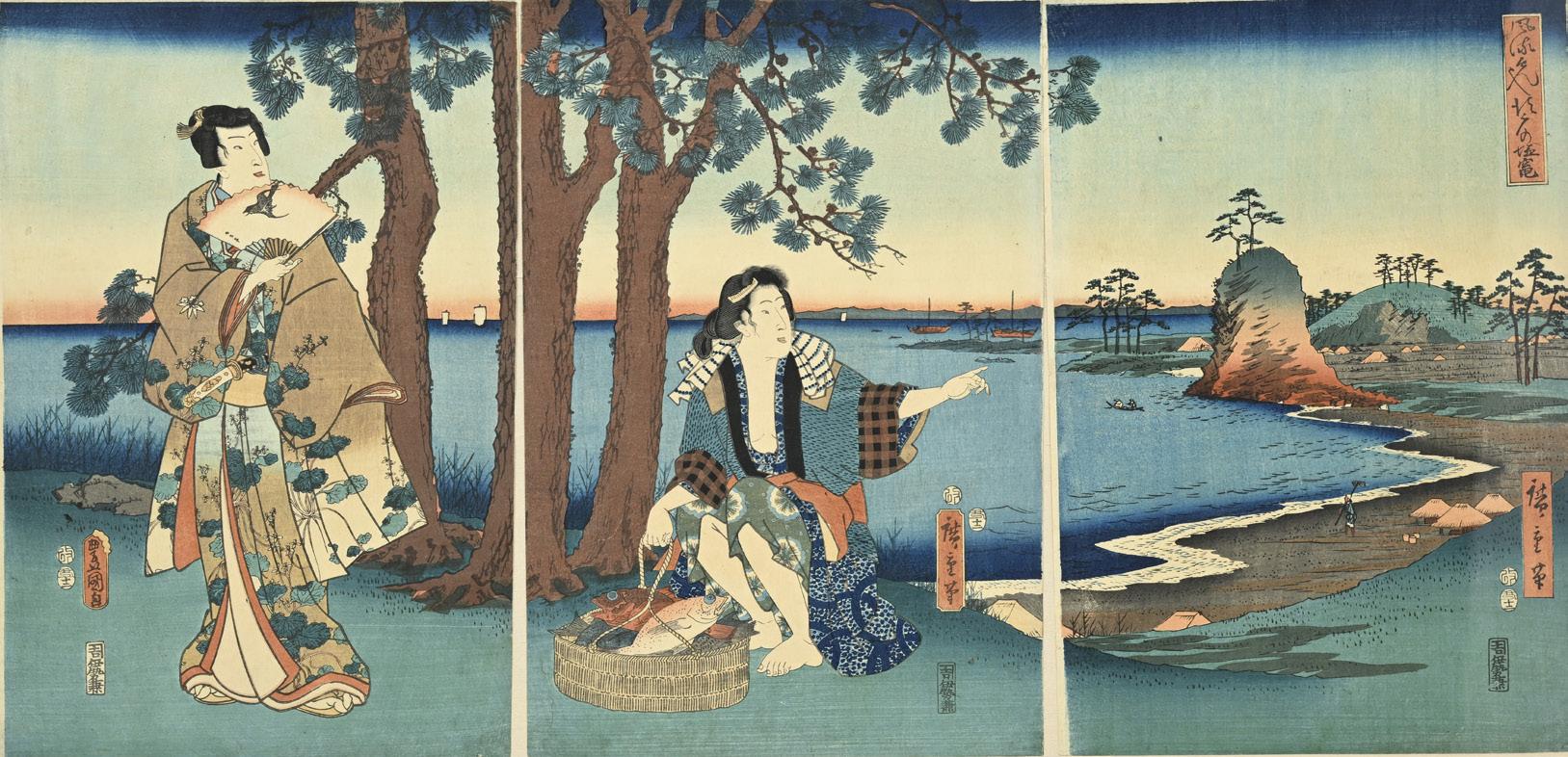 1776. Utagawa Hiroshige (1797-1858) et Utagawa Kunisada (1786-1864), triptyque, estampes au format ôban tate-e, Japon, époque Edo, 風 流けんし須磨の塩亀 (Fûryû Genji Suma no Shiogama, "Genji élégant aux fours à sel de Suma"), 37x76 cm (triptyque, à vue)