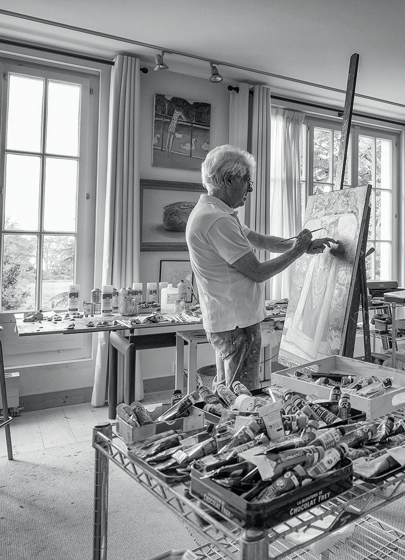 mystique, personnifiée par une figure féminine immuable et raffinée dans des décors intemporels, est un leitmotiv dans son œuvre. À travers ses toiles, Jean-Pierre Cassigneul tisse un dialogue subtil entre la beauté classique et une modernité délicate, prenant ses distances avec les courants dominants et avantgardistes tout en les réinterprétant à sa manière.