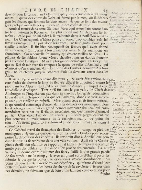 3169. [Général Dufour]. FOLARD-THUILLIER. Histoire de Polybe [...] ou toutes les grandes parties de la guerre, soit pour l’Offensive, soit pour la Défensive, sont expliquées, démontrées, et représentées en figures. Amsterdam, aux depens de la compagnie, 1729. 2 tomes en 1 vol. Orné de 3 vignettes en-tête et de 38 planches gravées hors texte la plupart dépliantes. Uniquement les tomes 2 et 3 de cet ouvrage originellement en 6 tomes. Notre exemplaire est abondamment annoté d’observations critiques de la part du général Dufour qui commente et compare les propos de l’auteur selon les avancées tech niques et stratégiques militaires de son époque. Véritable objet d’étude pour G.H. Dufour pour parfaire sa pratique militaire et technique.