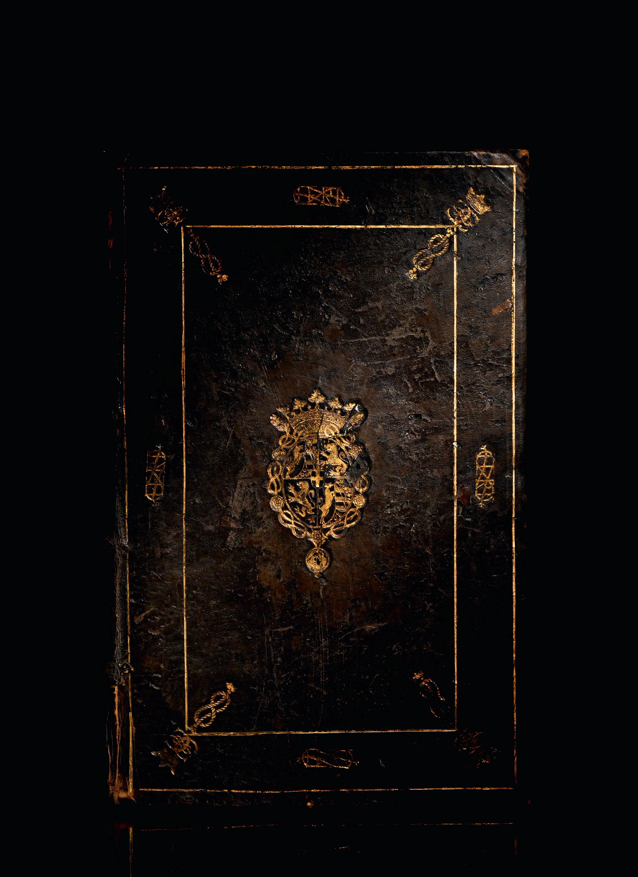 5. [ARMES]. Belle reliure vide figurant les grandes armes de Charles-Emmanuel Ier (15621630), Duc de Savoie et Prince de Piémont, ceintes des colliers de l’Annonciade et de la Toison d’or, reposant sur la croix de l’ordre de Saint-Lazare au plat supérieur, et celle d'un évêque au plat inférieur, XVIIe s., in-4° plein vélin polychromé et doré à rabats. Qlqs restaurations, ancien verni de protection 700-900