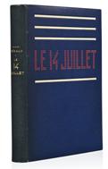 2679. [VILLEBŒUF] - BÉRAUD (Henri). Le 14 juillet. [Paris], Daragnès pour les XXX de Lyon, [1933]. In-4° relié plein maroquin bleu nuit, dos lisse, décor mosaïqué de blanc et de rouge figurant le titre au plat supérieur, gardes mosaïquées de maroquin bleu et blanc et box rouge, couv. et dos d’origine conservés, tr. dorées. Reliure signée Marot-Rodde. Orné de 47 eaux fortes d'André Villeboeuf. Édition peu commune en tirage très limité à 95 exemplaires, le nôtre un des 30 exemplaires nominatifs comprenant une des 50 suites des illustrations sur Japon. Très bel exemplaire bien établi malgré un dos légèrement insolé Ex-libris Léon Givaudan 1.000-1.500