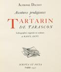 2669. [SCHMIED] - KIPLING (Rudyard). Kim. Lausanne, Gonin et Cie, 1930. 3 vol. in-4° en ff., couvertures illustrées, sous chemises et emboîtage de l’éditeur. Orné de nombreuses compositions en bois gravé de François-Louis Schmied dont un frontispice, 14 planches hors texte et vignettes, lettrines et culs-de-lampe. Édition en tirage limité à 160 exemplaires sur japon, celui-ci hors justification destiné aux collaborateurs de M.M Gonin et Cie, enrichi d’une triple suite des planches dont une en noir, et une suite des essai de couleurs. Charmant exemplaire avec qlqs petites rousseurs éparses