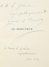 2648. [MARTY] - HOUVILLE (Gérard d’). Le Séducteur. S. l., Les Bibliophiles de l’Amérique latine, 1926. In-4° relié plein maroquin citron, dos à nerfs orné, doré et mosaïqué, plats ornés et dorés aux petits fers dans un décor mosaïqué de maroquin marron, gardes de maroquin marron en encadrement de deux cuivres non rayés. Reliure signée et datée Noulhac 1930. Orné de 48 eaux fortes par André-Édouard Marty, aquarellées par Jean Saudé. Tirage limité à 135 exemplaires, le nôtre un des 100 réservés aux membres de la compagnie, enrichi de deux cuivres non rayés montés aux gardes, de deux aquarelles originales dont celle du frontispice, d’une suite des illustrations en noir sur Chine, de deux envois autographes respectivement signés de l’auteur et de l’artiste au faux titre à Léon Givaudan. Très bel exemplaire dans une reliure signée bien établie