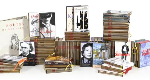 2664. [PLÉIADE]. Collection complète des albums de la Pléiade Paris, NRF, depuis 19602023. 65 vol. in-12 et un album vinyle, reliures de l’éditeur, certains avec tranche de tête saumon, jaquettes, rhodoïds et étuis cartonnés. Bel ensemble en très bon état, complet des albums publiés depuis 1960 jusque 2023 et du vinyle 33 tours de 1961. Très bon état 1.500-2.000