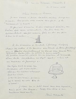la missive. Il y décrit avec précision le cadre à réaliser ainsi que la mise en place de la toile sous une cloche à fromage, afin de constituer un objet intitulé « Ceci est un morceau de fromage ». Cette sculpture surréaliste aurait été réalisée pour la première fois vers 1936-1937. La lettre est adressée à Mme Zervos, qui pourrait être Yvonne
