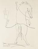 2663. [PICASSO] - SUARES (André). Hélène chez Archimède. Paris, Nouveau cercle parisien du livre, 1955. In-folio en ff., couverture rempliée, sous chemise et emboîtage. Orné de 22 compositions de Pablo Picasso gravées sur bois par Georges Aubert. Édition tirée à 240 exemplaires numérotés sur papier vélin, celui-ci un des 140 exemplaires réservés aux membres de la Société nominatifs. Bel exemplaire malgré qlqs minimes usures à l’emboîtage 1.000-1.500