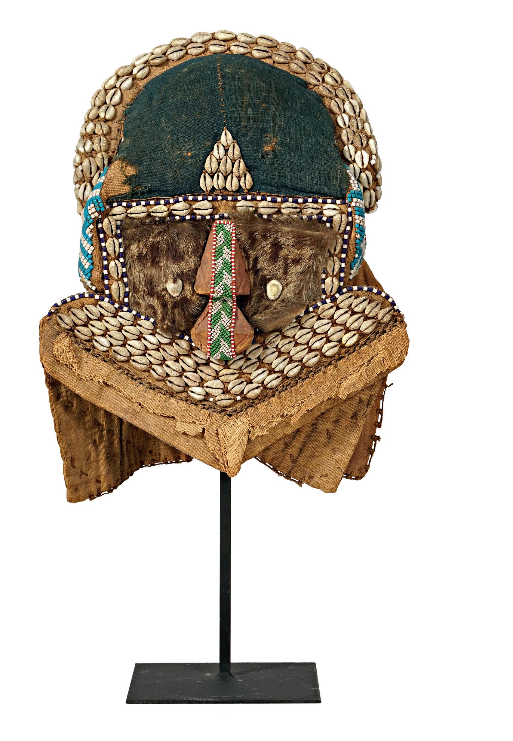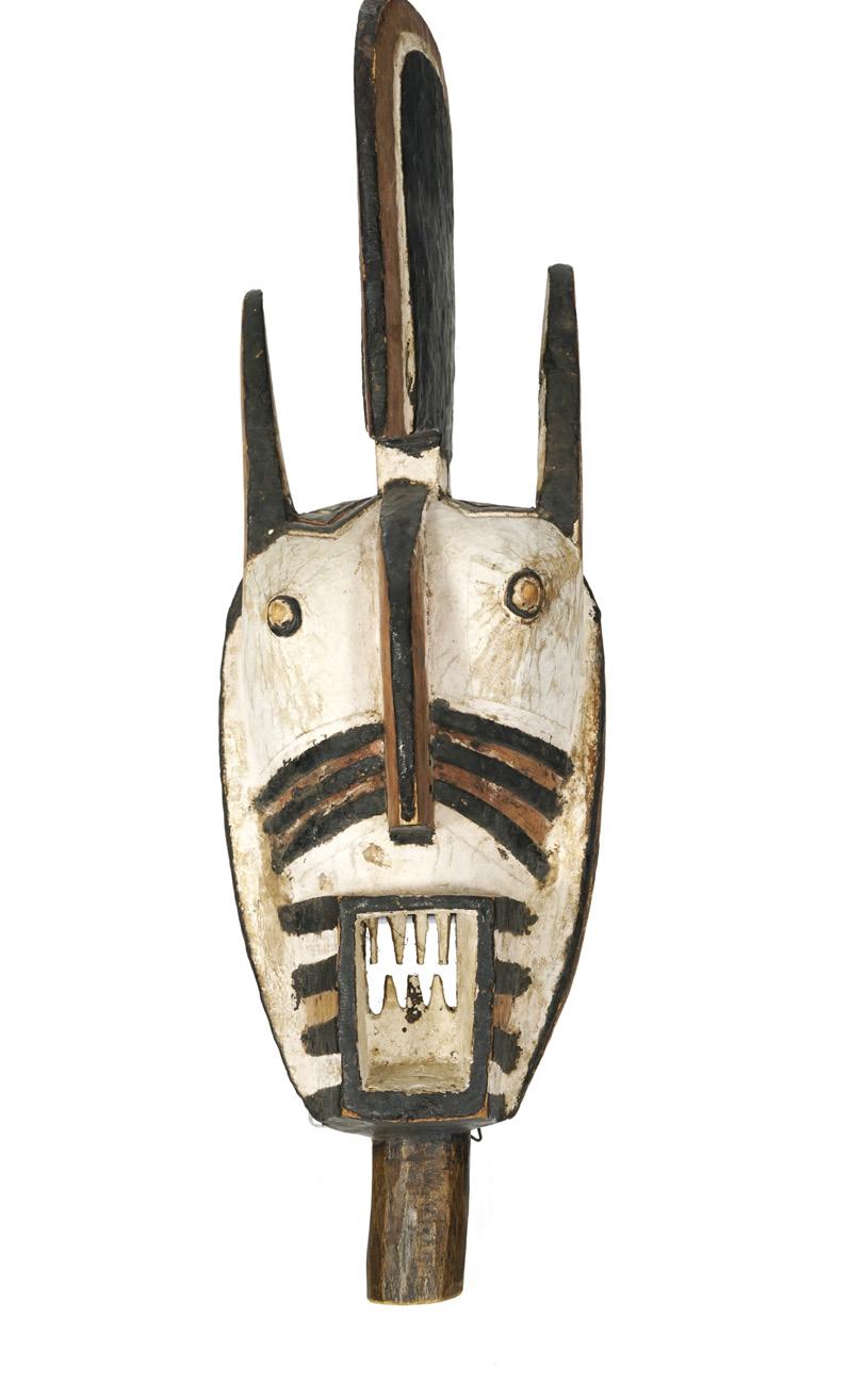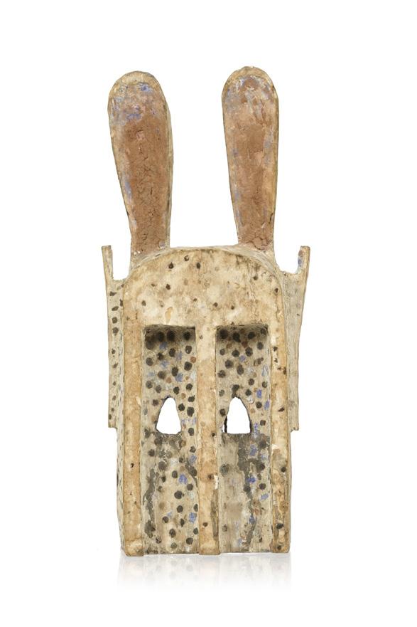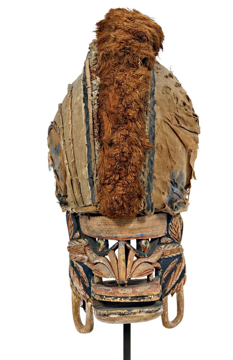 44. Masque de danse tatanua de NouvelleIrlande, bois, pigments noirs, ocres, blancs et bleus, fibres, rotin et tissu, Papouasie-Nouvelle Guinée, h. 42 cm. Beau masque ancien en bois ajouré, la coiffe imposante surmontée d’une crête typique