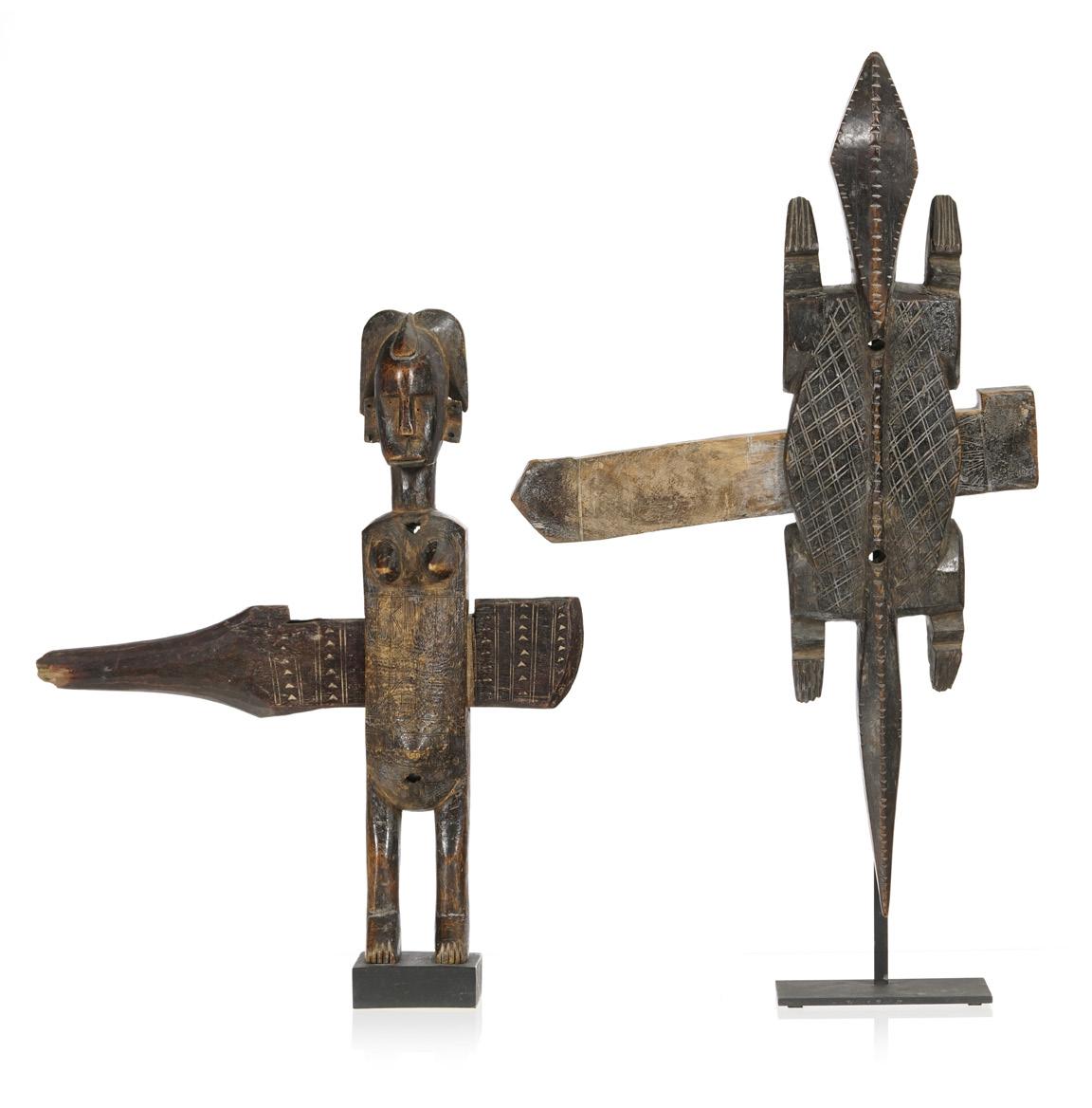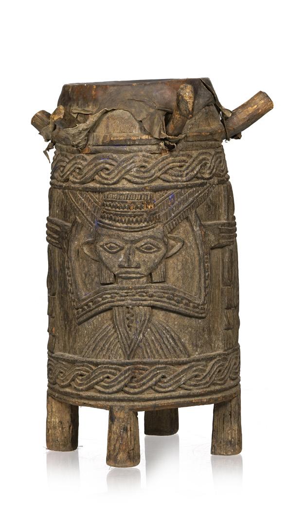 45. Haute statuette féminine senoufo déblé, bois dur à patine brune, Côte d’Ivoire, h. 79,5 cm. Les pieds et les mains sont sculptés avec démesure, l’abdomen saillant est scarifié, tout comme le cou, le front et le haut des bras, la coiffe composée d’une crête et de 2 tresses latérales. Sur piédestal rond.
