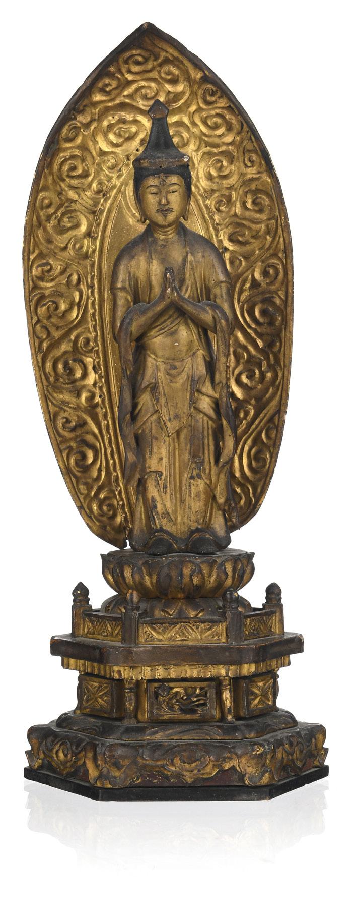 3922. Divinité debout, probablement Kannon, sculp ture en bois laqué et doré, Japon, époque Meiji, sur un piédestal lotiforme à degrés, devant une mandorle, les mains adoptant l’anjali mudra, incrustation d’une bille de verre pour le byakugo (urna), h. 33 cm (sans mandorle) (dégâts et restaurations) 400-600