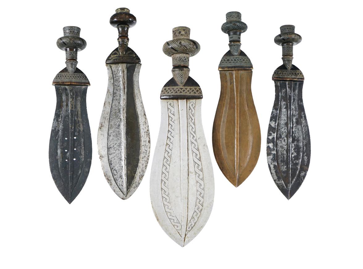 3929. Ensemble de 4 armes en alliages cuivreux, Asie, cultures pré-classiques: 1 dague au manche de jade, 1 tête de lance allongée, 1 tête de lance rectangu laire au décor de pêcheurs, Viet nam, culture de Dong Son (Xe s. av. J.-C.-Ier s. ap. J.-C.), l. max. 37,5 cm, 1 harpon zoomorphe, Inde, civilisation de la Vallée de l’Indus (IIIe millénaire av. J.-C.-Xe siècle av. J.-C.), l. 18,5 cm 800-1.200