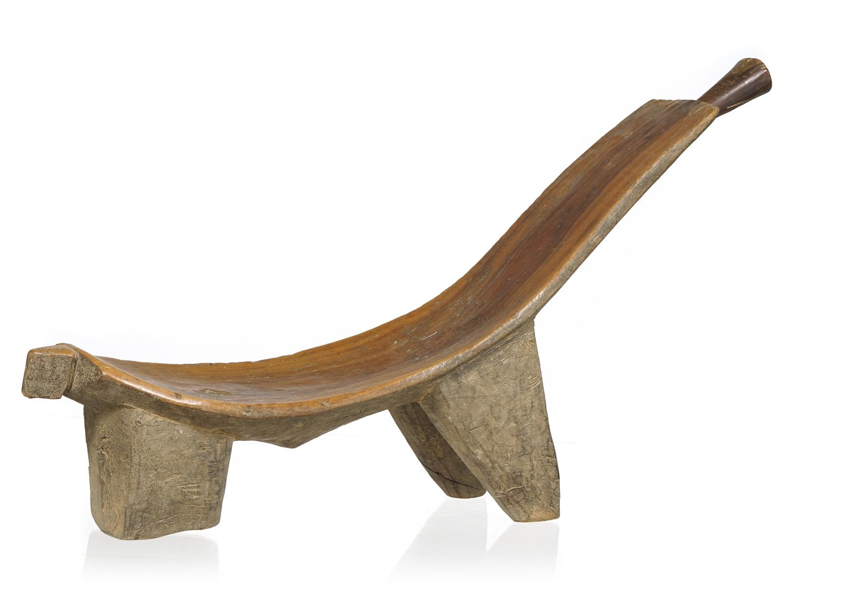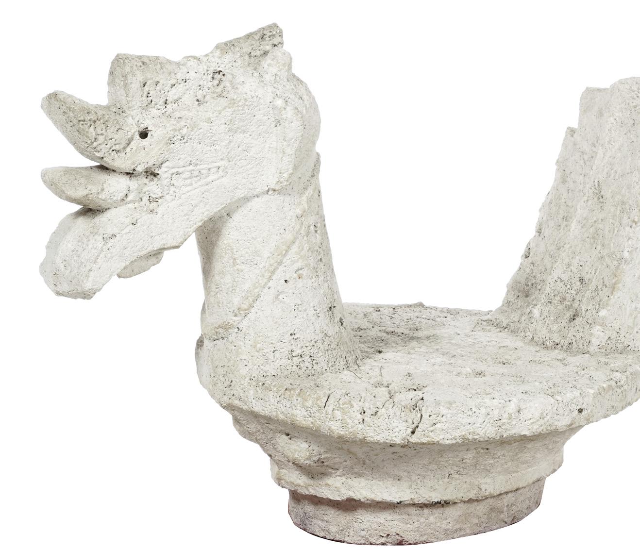 3950. Siège cérémoniel d’honneur Osa’Osa en forme de lasara (créature mythique hybride à corps de cerf et à tête de dragon), pierre calcaire, île de Nias, région de Gomo, Indonésie, XXe s., h. 64,5 cm. Ce type de siège est utilisé dans le cadre d’une fête de mérite (owasa) comme signe matériel de l’élévation de l’hôte dans la hiérarchie sociale de la communauté. La gueule béante de l’animal rend compte son aptitude à parler au village, et la nécessité pour ce dernier d’écouter cette parole. Provenance: collection Gérald et Muriel Minkoff, Genève 2.000-3.000