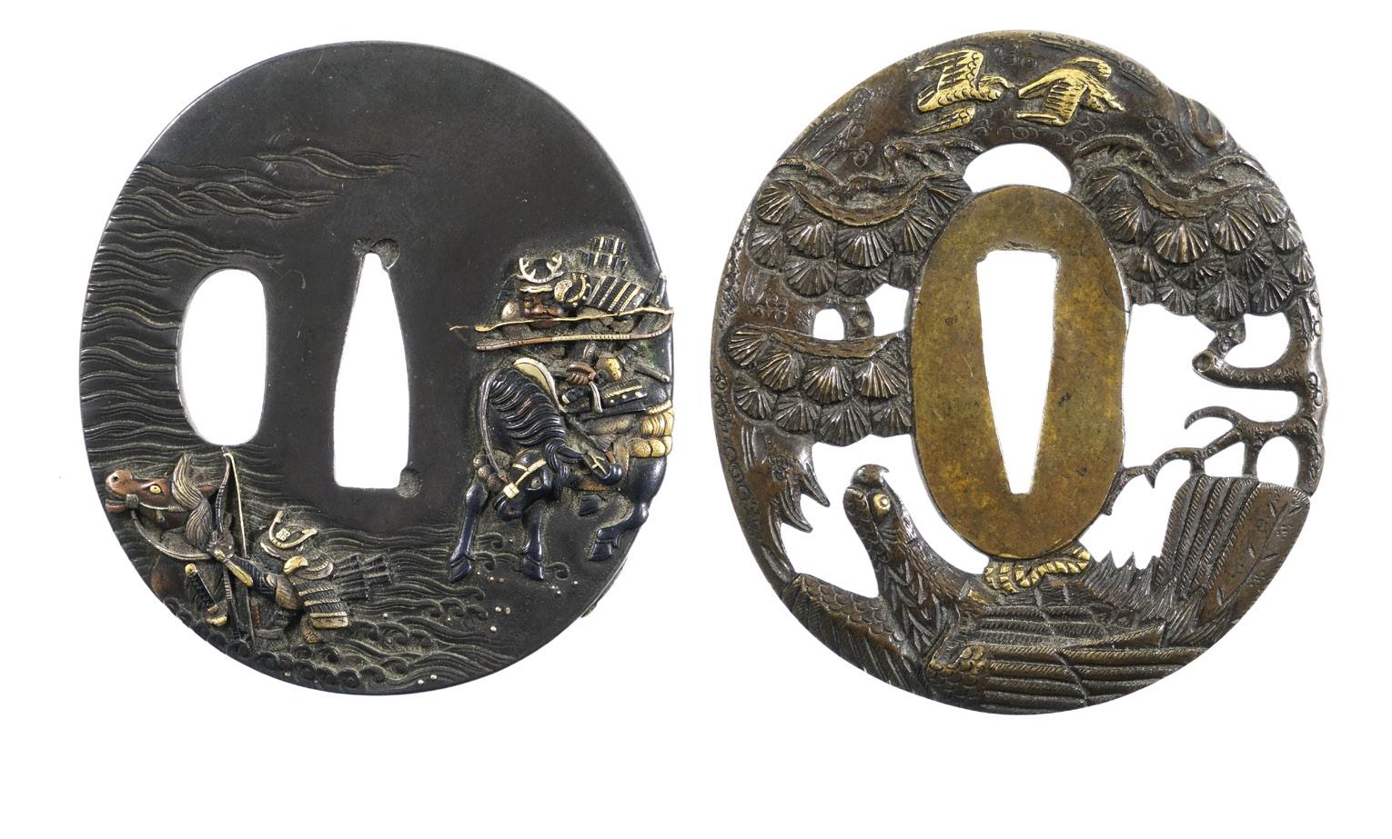 3923. 2 tsuba en métal de forme maru gata, Japon, époque Meiji, un partiellement ajouré orné d’aigle, pins et autres oiseaux, l’autre orné de samouraï à cheval dans les flots, diam. 6 cm 300-500