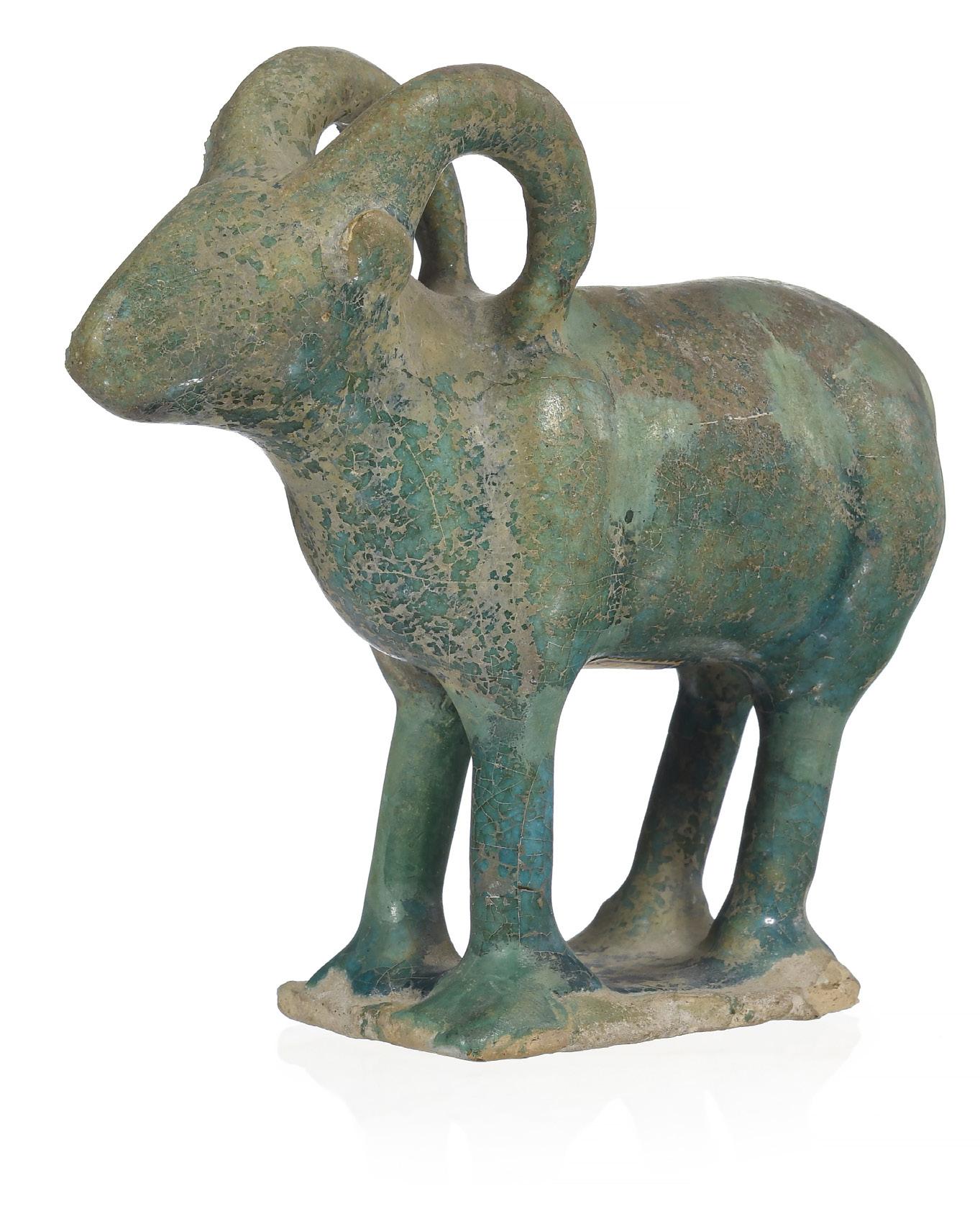 3956. Bélier en terre cuite à glaçure turquoise, Iran, Kashan, XIIIe s., 14x14,5 cm environ (res taurations)