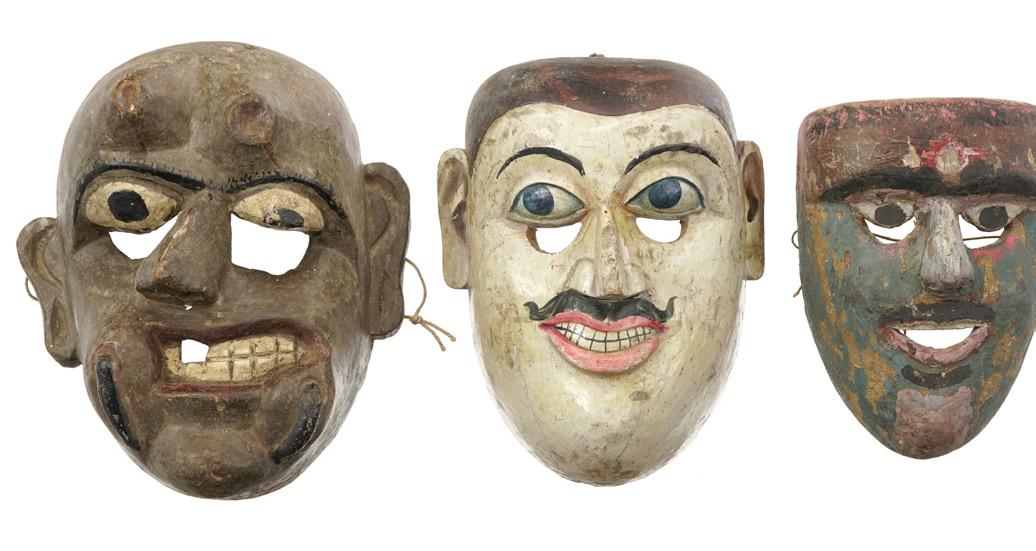 3943. Ensemble de 3 masques en bois peint, Sri Lanka, XXe s.: 1 au visage brun, avec cornes, 1 au visage blanc, avec moustache, 1 au visage turquoise foncé, tailles diverses 200-300