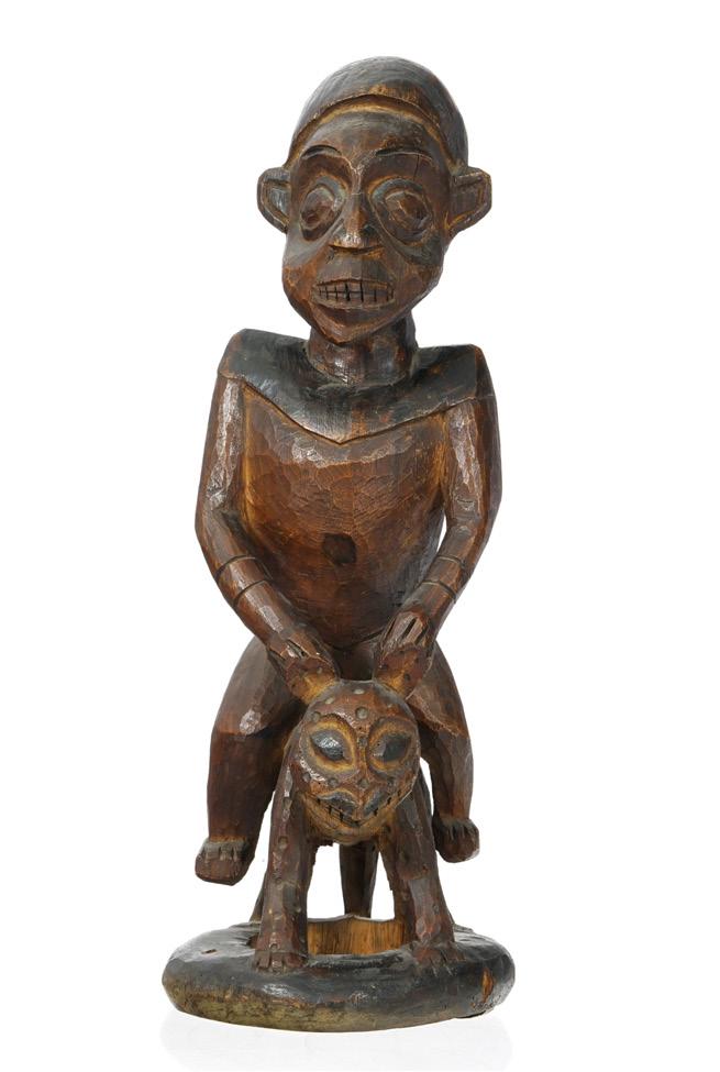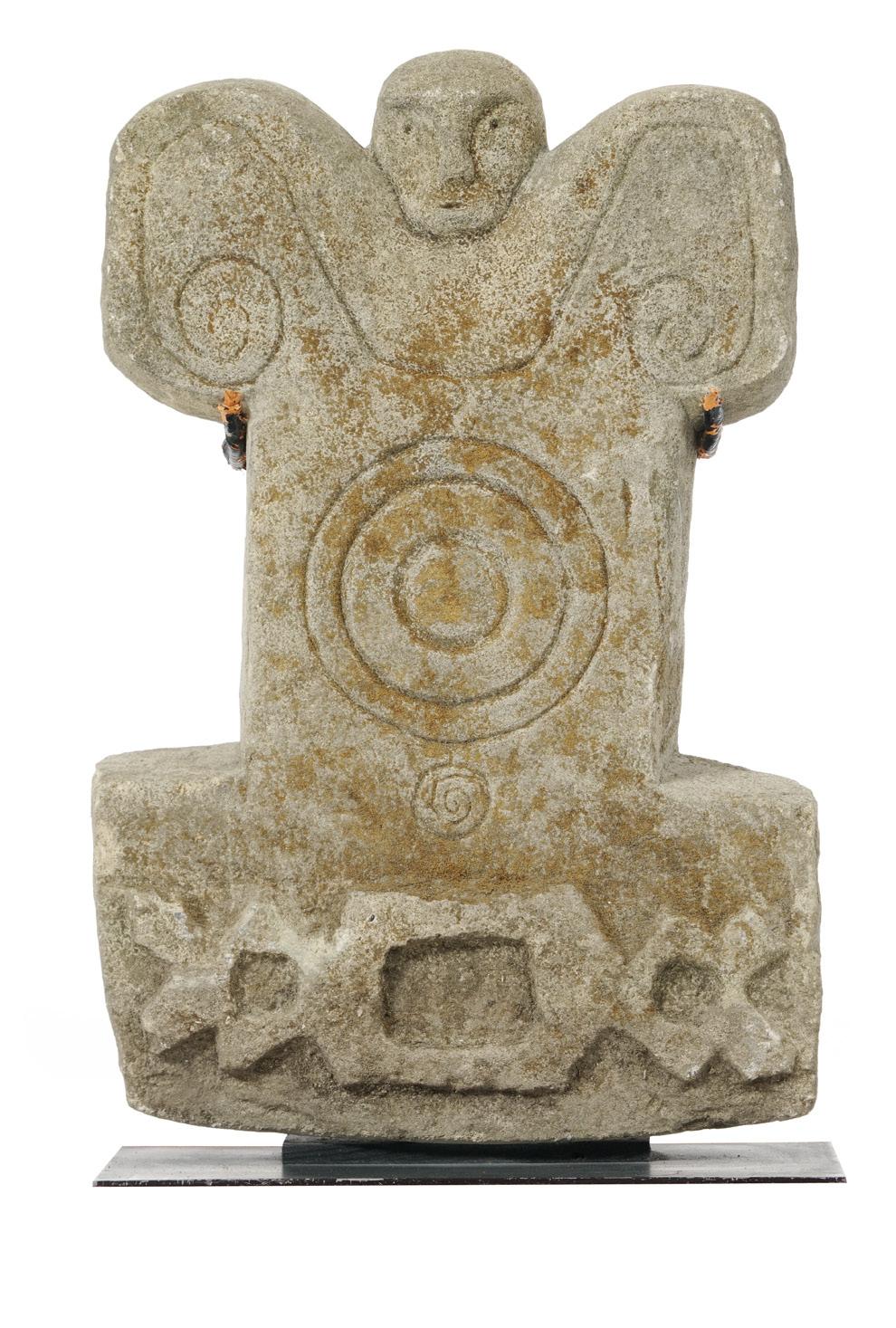 3949. Penji (monument funé raire) en pierre avec personnages et animaux, Sumba, Indonésie, XIX-XXe s., surmonté d›une tête avec coiffe, un côté orné de singe, oiseau et motifs géométriques, l’autre décoré de cavalier, personnage et animal, sur socle, h. 89 cm 300-500
