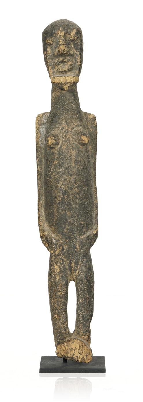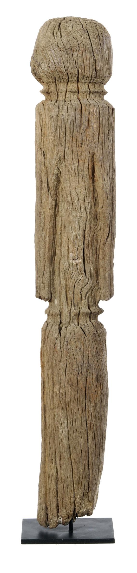3951. Poteau funéraire en bois érodé, Dayak, montrant un per sonnage vêtu d’une coiffe, h. 115,5 cmProvenance: collection Gérald et Muriel Minkoff, Genève, acquis en 1973 à Djakarta 1.000-1.500