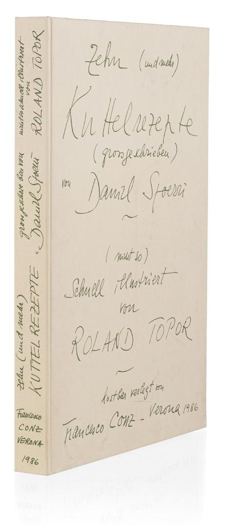 3142. SPOERRI (Daniel)TOPOR (Roland). Zehn (und mehr) Kuttelrezepte... Vérone, Francesco Conz 1986. In-folio en ff., sous emboîtage en toile illustré de l’éditeur. Composé d’1 f. de titre, 10 doubles feuilles avec recettes et 10 lithographies originales en couleurs, signées par Spoerri et Topor au plomb, 10 feuilles avec recettes et 10 lithographies originales en couleurs, signées, un leporello de recette et une planche cartonnées avec 7 photos couleurs montées titrées «Trippaverkäufer auf dem Markt von Catania (Sicilien) Okt. 85» signé à l’encre rouge. Tirage très limité à 75 exemplaires numérotés. Bel exemplaire malgré de très légères salissures à l’emboîtage 300-500