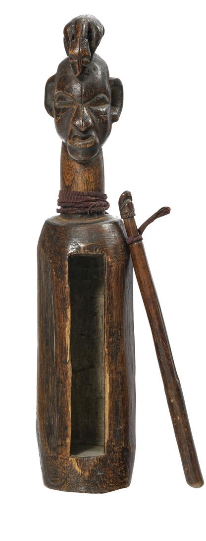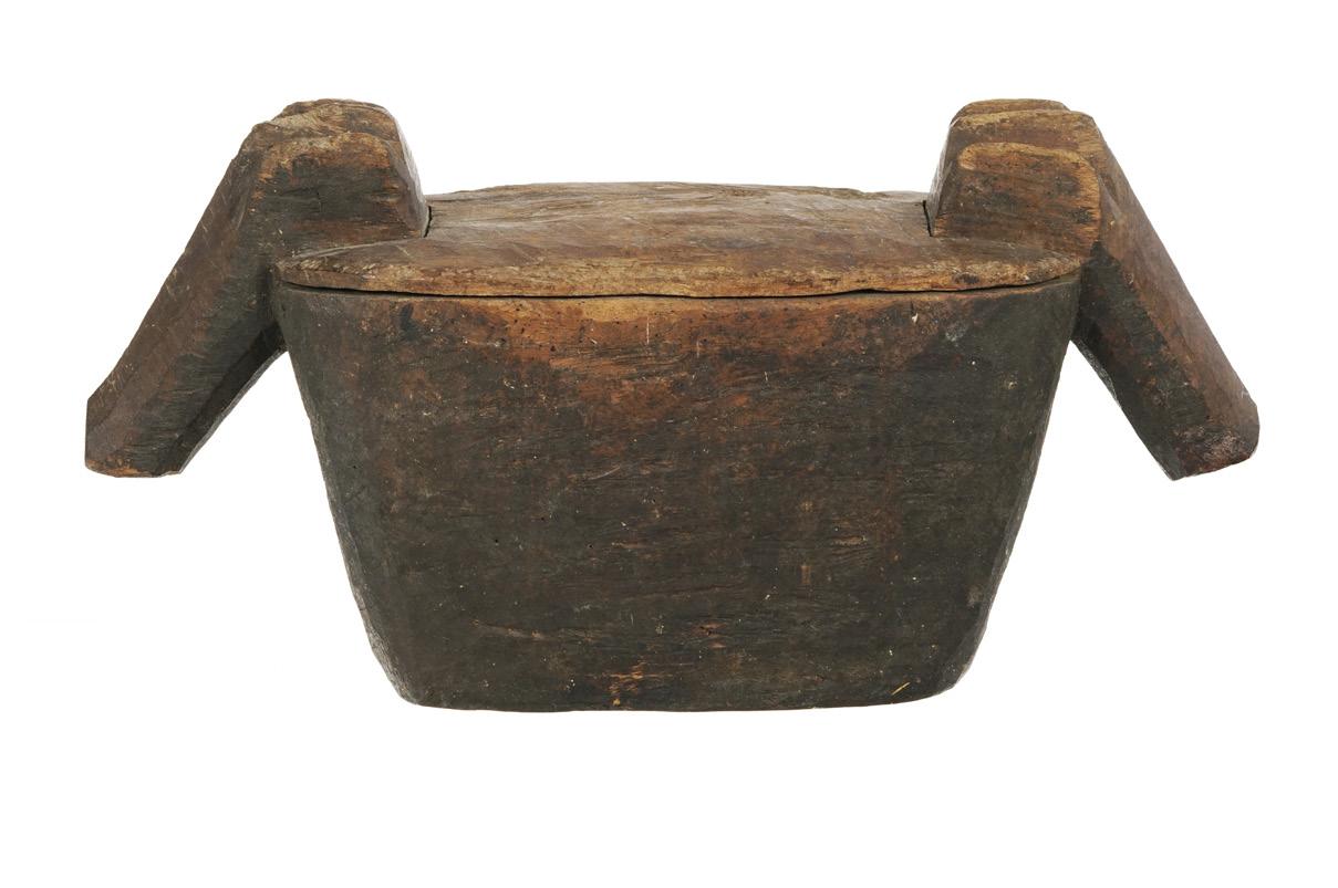 3937. Mortier en bois, Batak, Indonésie, XIX-XXe s., corps orné d’une tête de singha et de motifs géométrique, couvercle décoré d’un lézard et de motifs géométriques, l. 41,5 cm 300-500