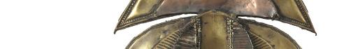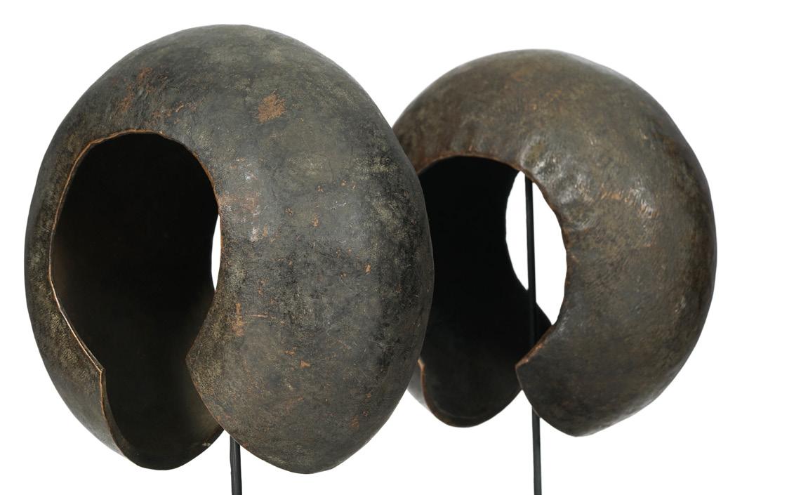 3933. Paire de pendants d'oreilles en métal, Dayak, ethnie Kenya/Kayan, Bornéo, XIX-XXe s., en forme d'aso ("dragon-chien", créature mythique présent dans l'art dayak) enroulé, l. 4,5 cm. Ces ornements servaient tant bien que pendants d'oreilles que de poids Provenance: collection Gérald et Muriel Minkoff, Genève