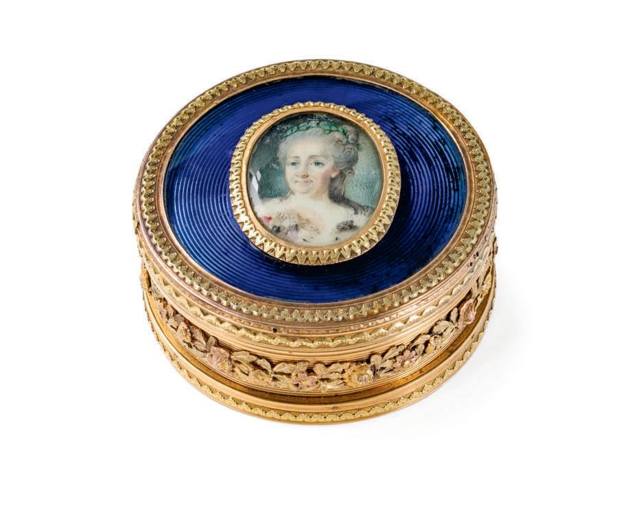 Tabatière ronde en or et émail, portrait de Catherine II de Russie, signée Ador St Petersbourg, circa 1780