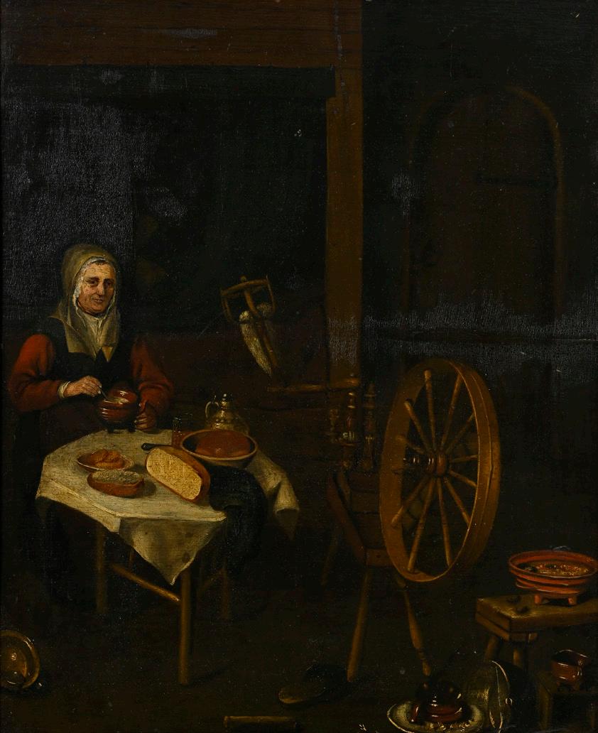 2047. Ecole flamande du XVIIe s., dans le goût de, Fileuse mangeant la soupe, huile sur panneau, 44,5x36,5 cm (à vue)